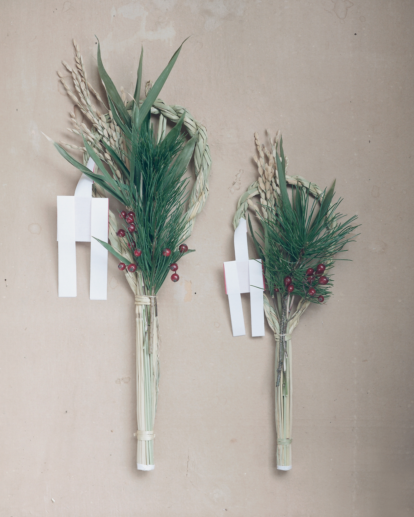 稲藁でつくる杓文字形に、祓い清めの「紙垂」、豊穣を表す「稲穂」、生命力を司る「竹・笹」、長寿や仕事運気を上げるという縁起の良い「五葉松」、魔除けと祝いの赤い実の「野茨」を飾り付ける。