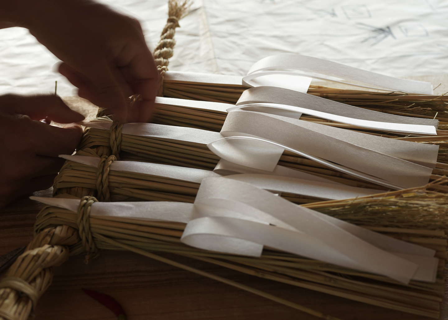 稲藁で綯われた”縄”は、「な」=幸福、「わ」=和を意味し、縄でつくられる場には「幸福と平和」の力が満ちるとされる。