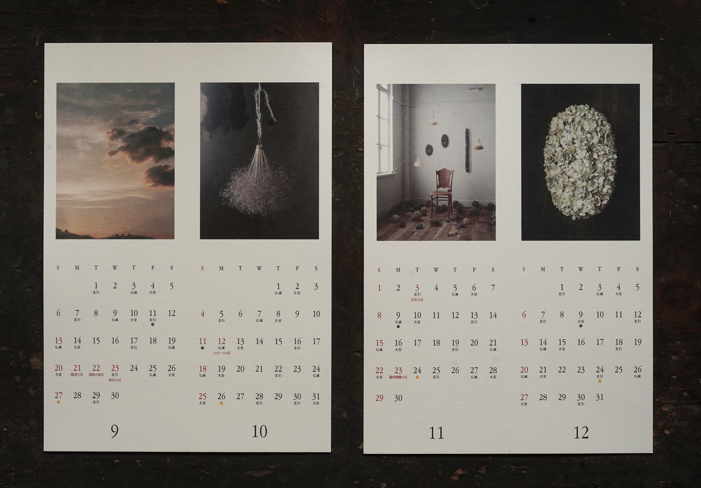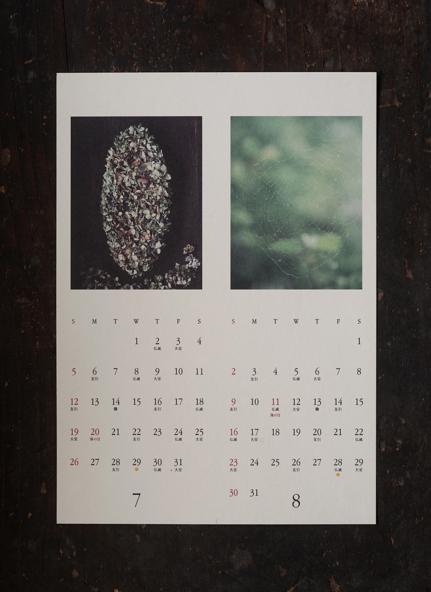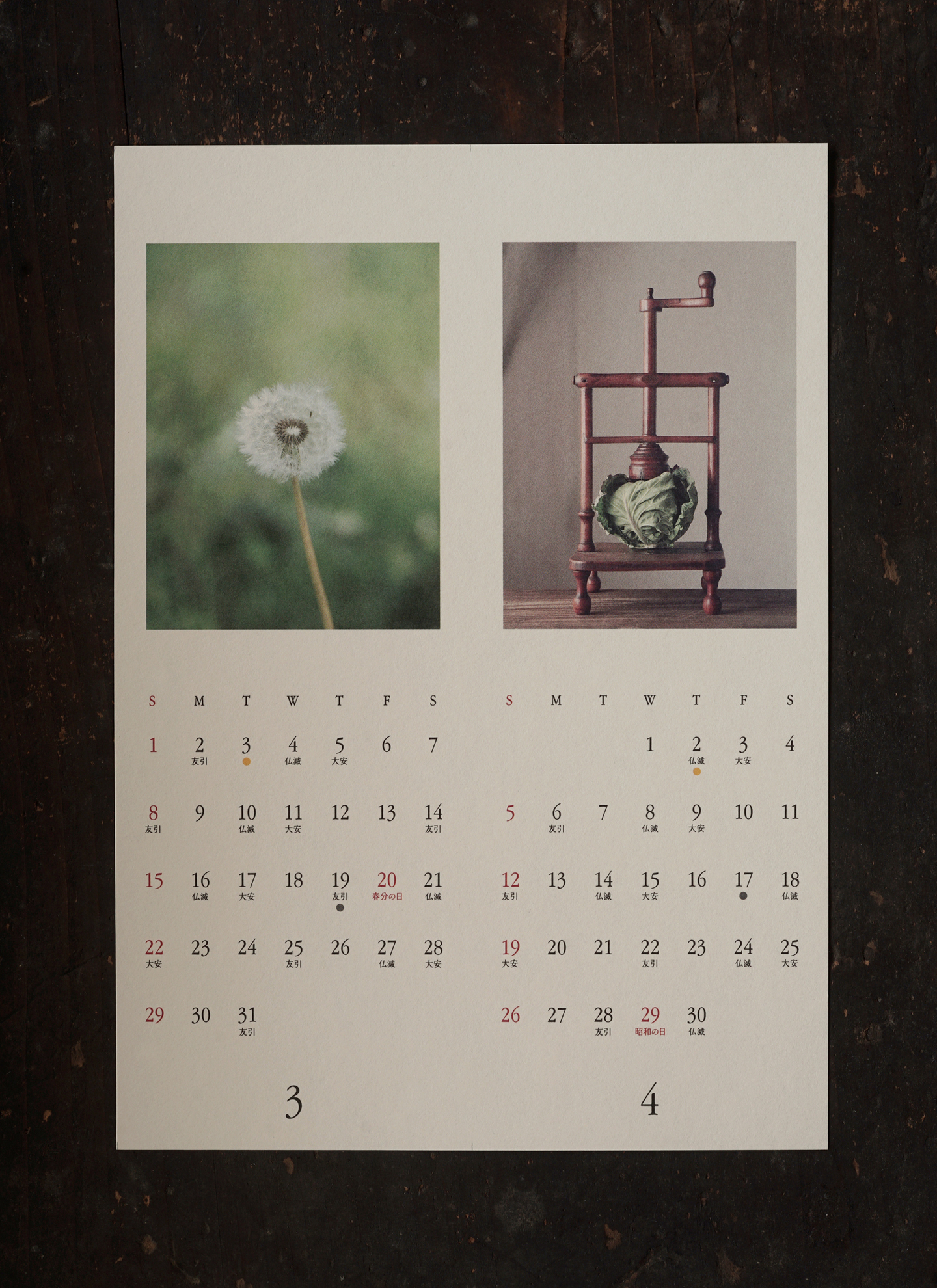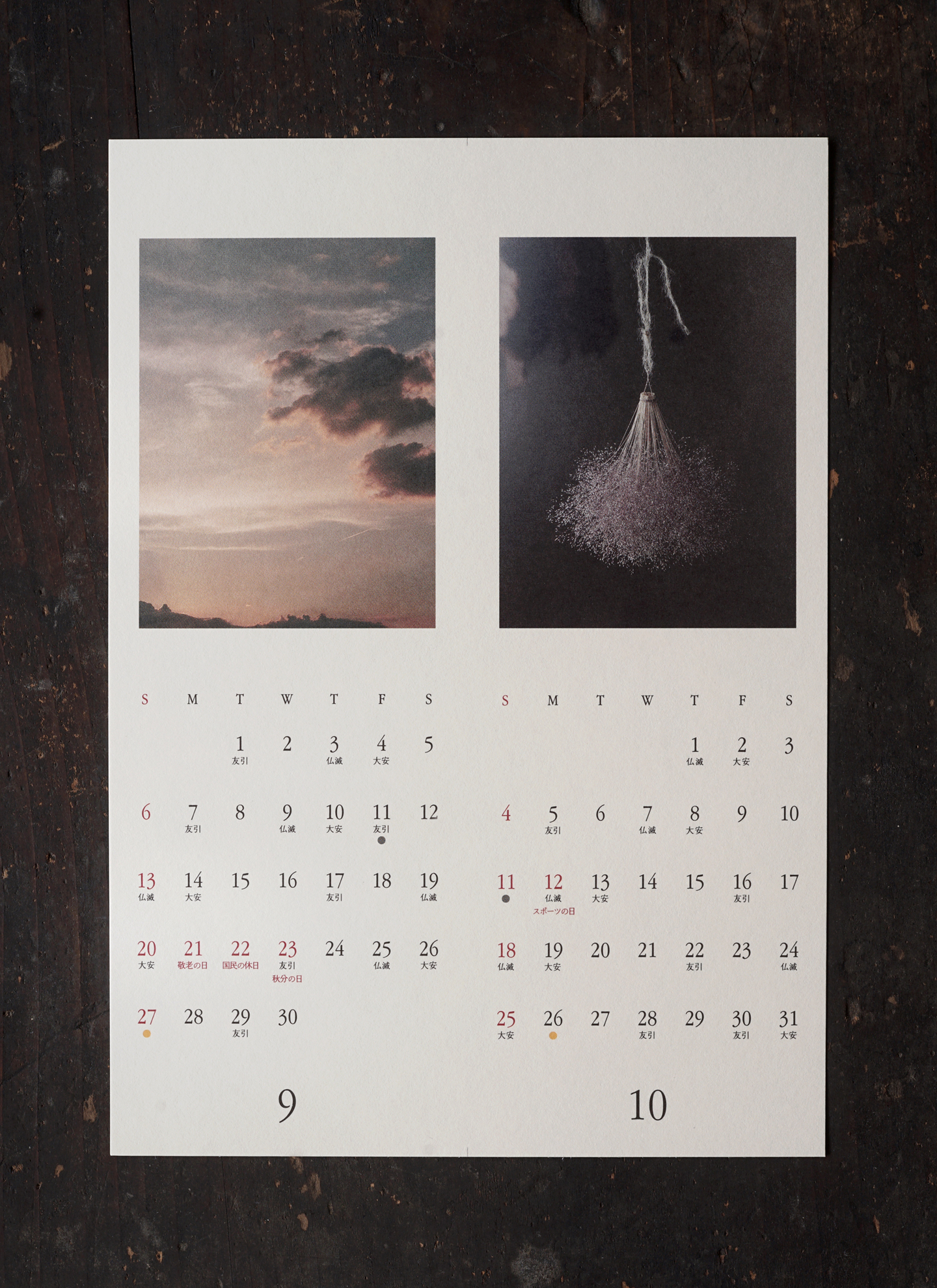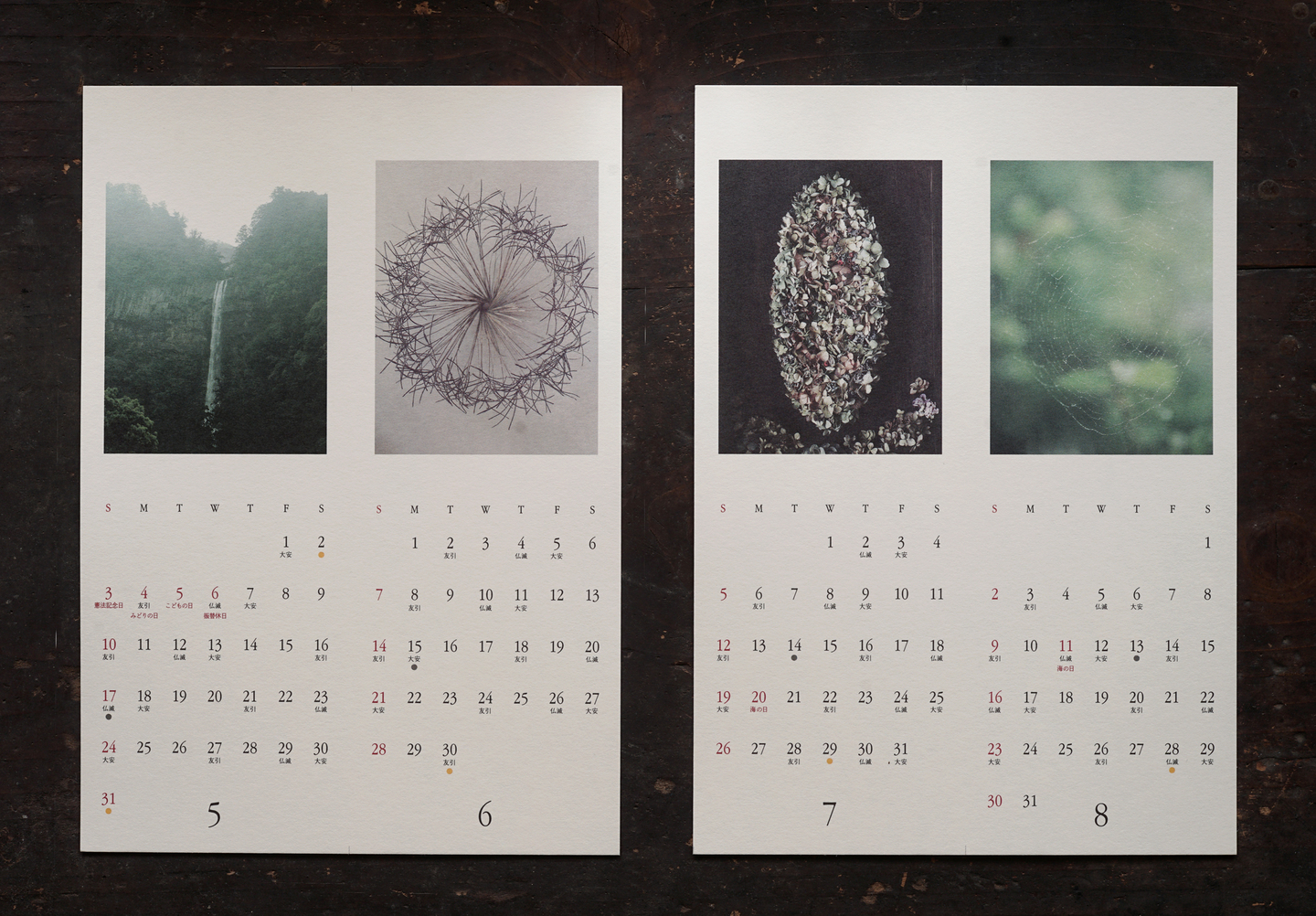 カレンダー表面には六曜の一部から「友引」「仏滅」「大安」と祝日、満月・新月の日を表記。