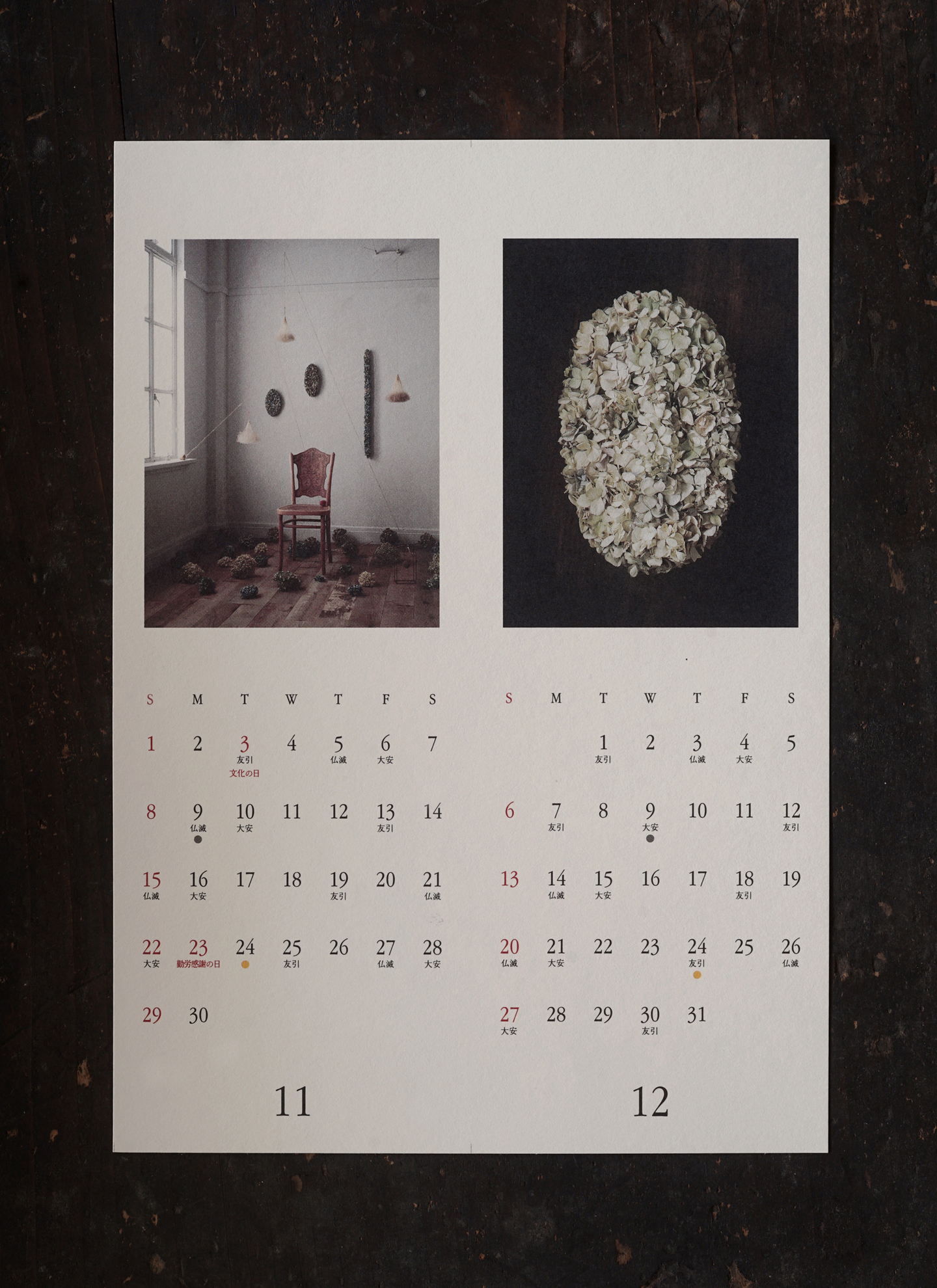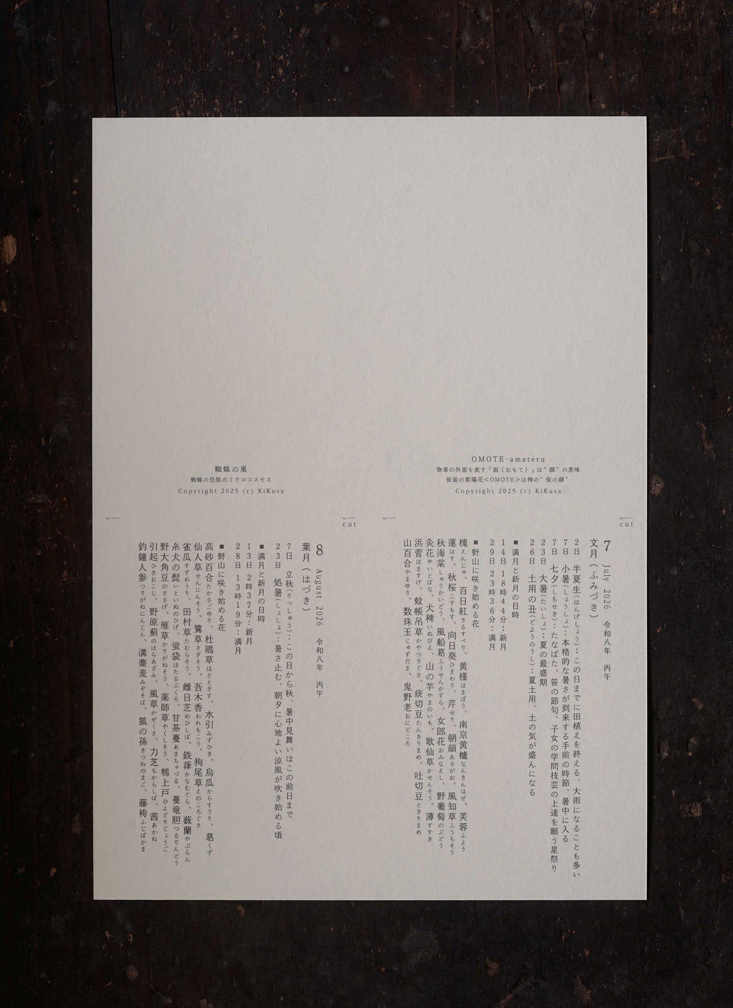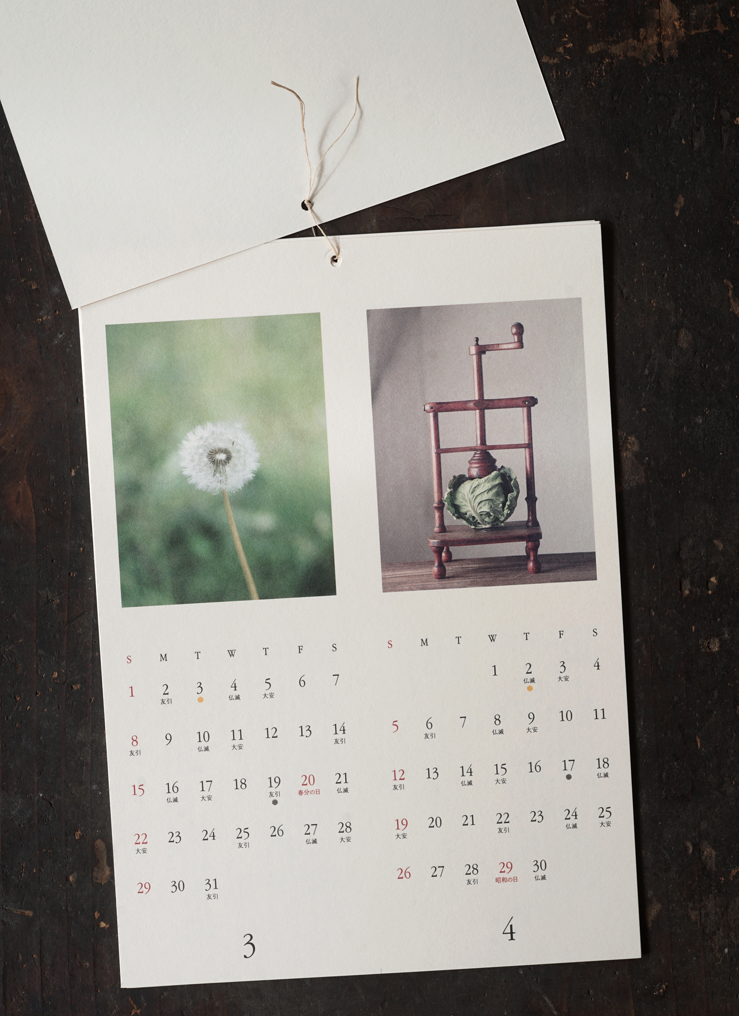 裏面には、二十四節気・五節句・雑節、満月・新月の日時、その月の野山に咲き始める花」の名を記す。