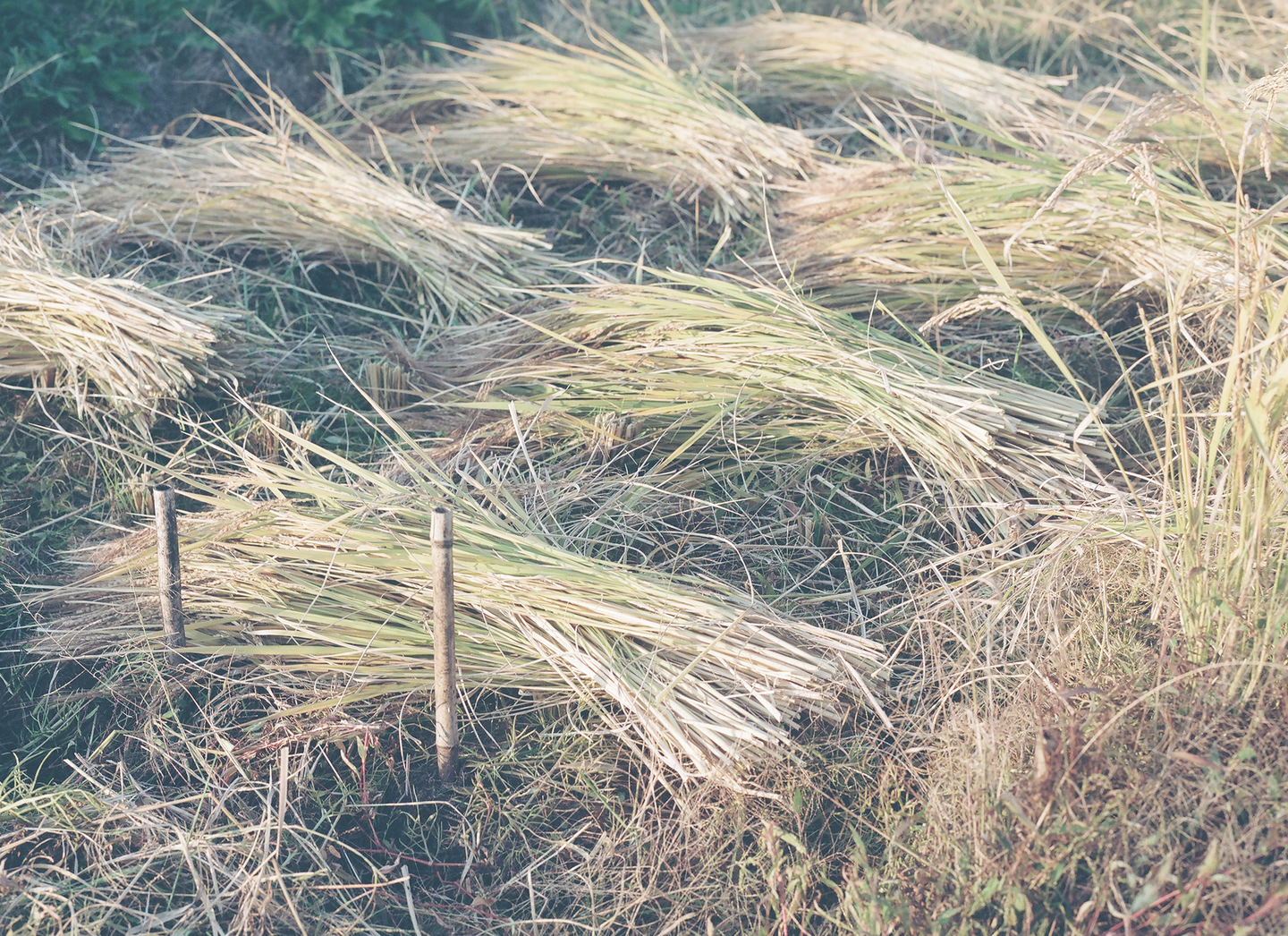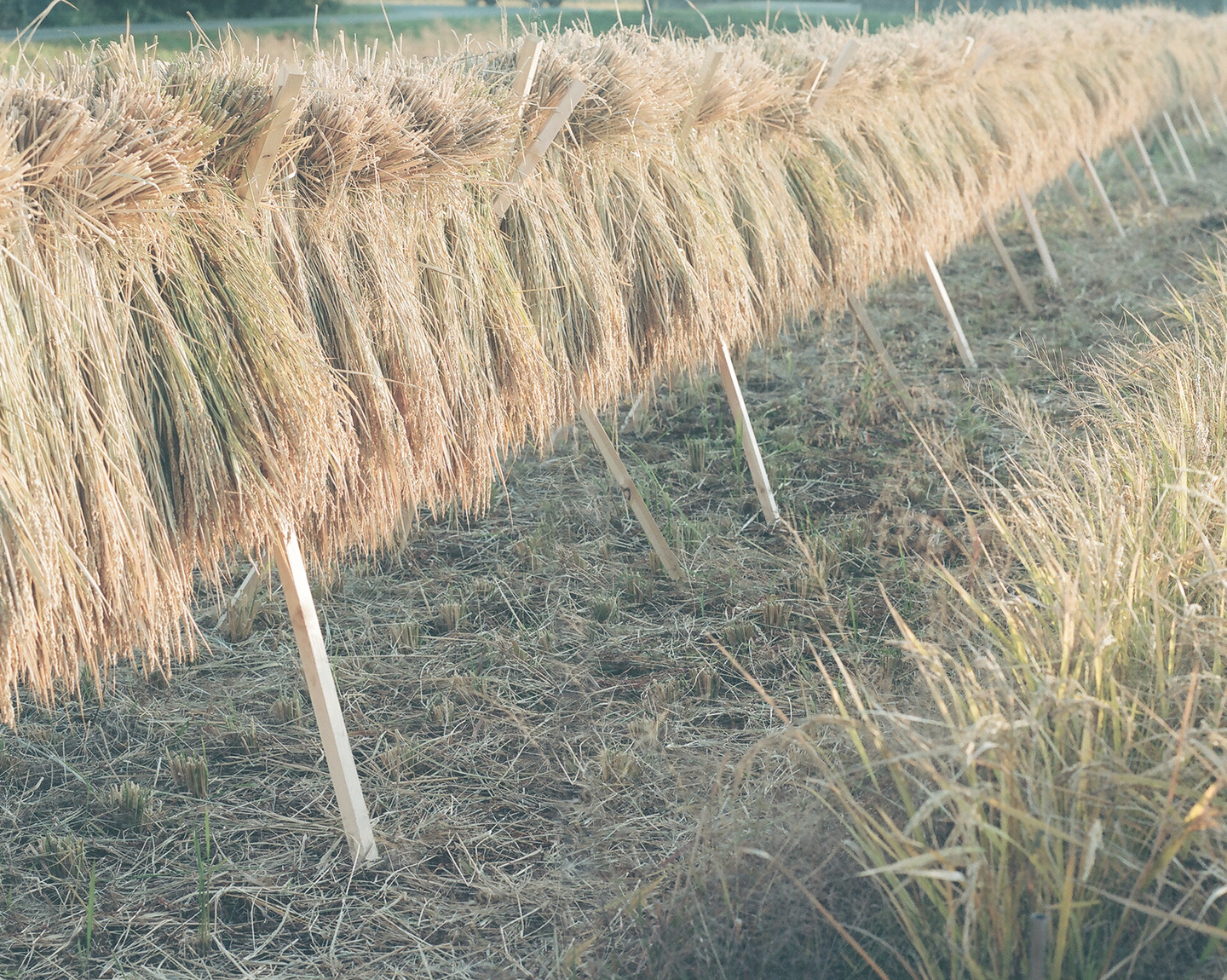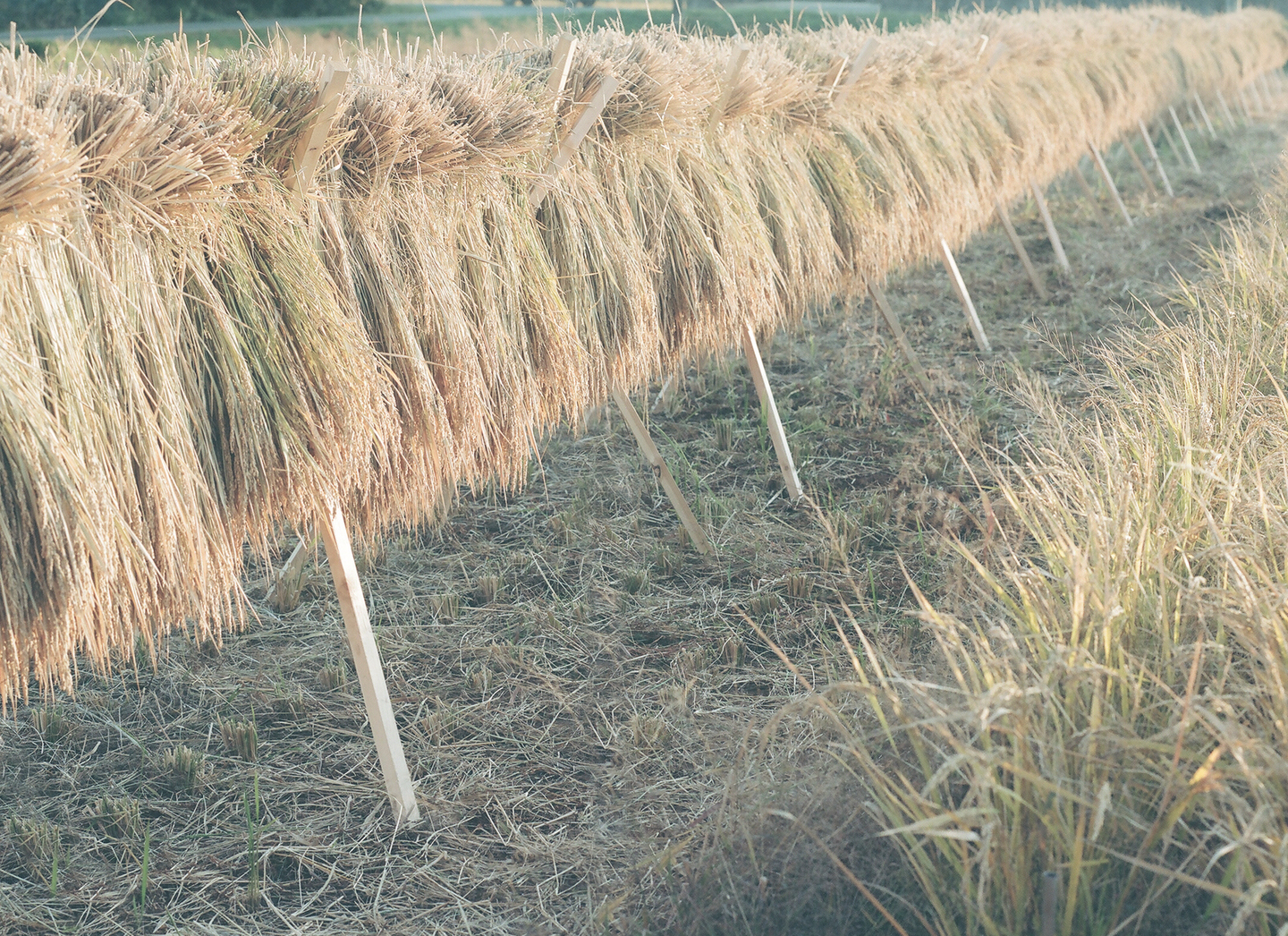 稲は太陽の光と自然風でゆっくり乾燥され、残った藁から栄養が米粒に移り、より成熟され旨味の詰まった美味しい米になる。