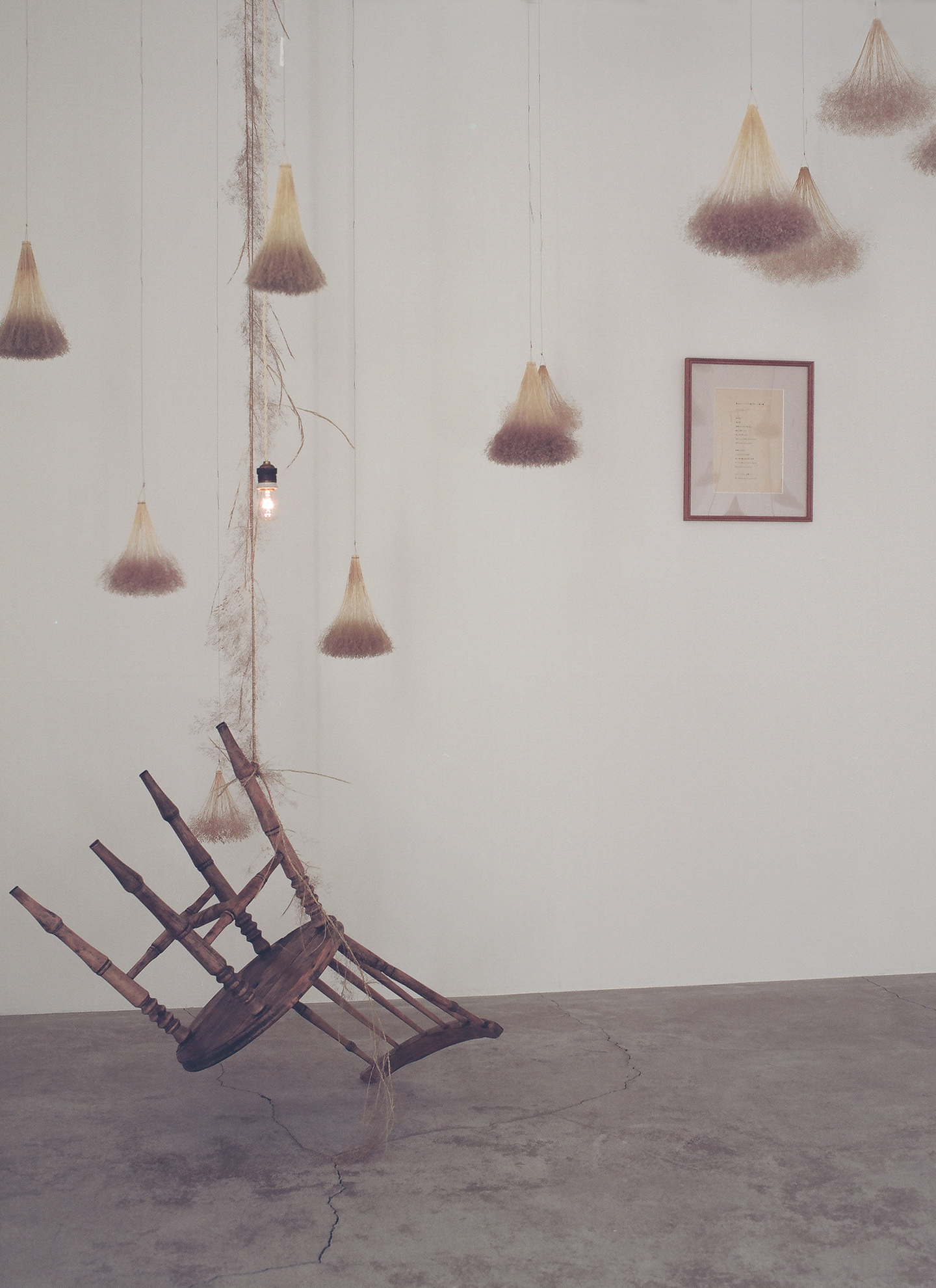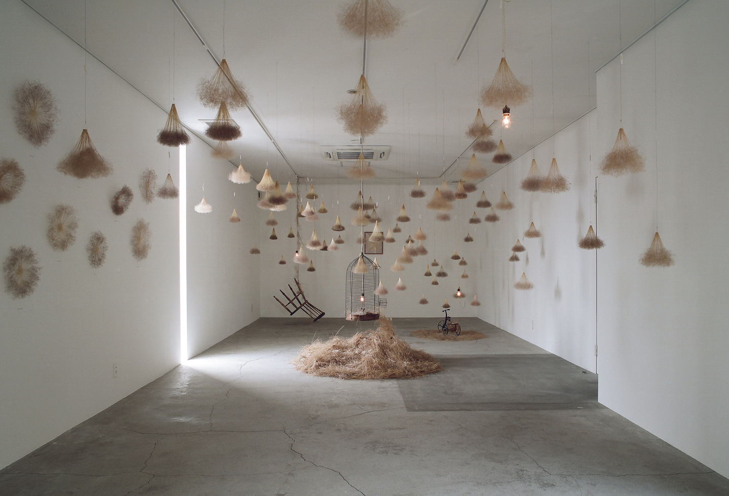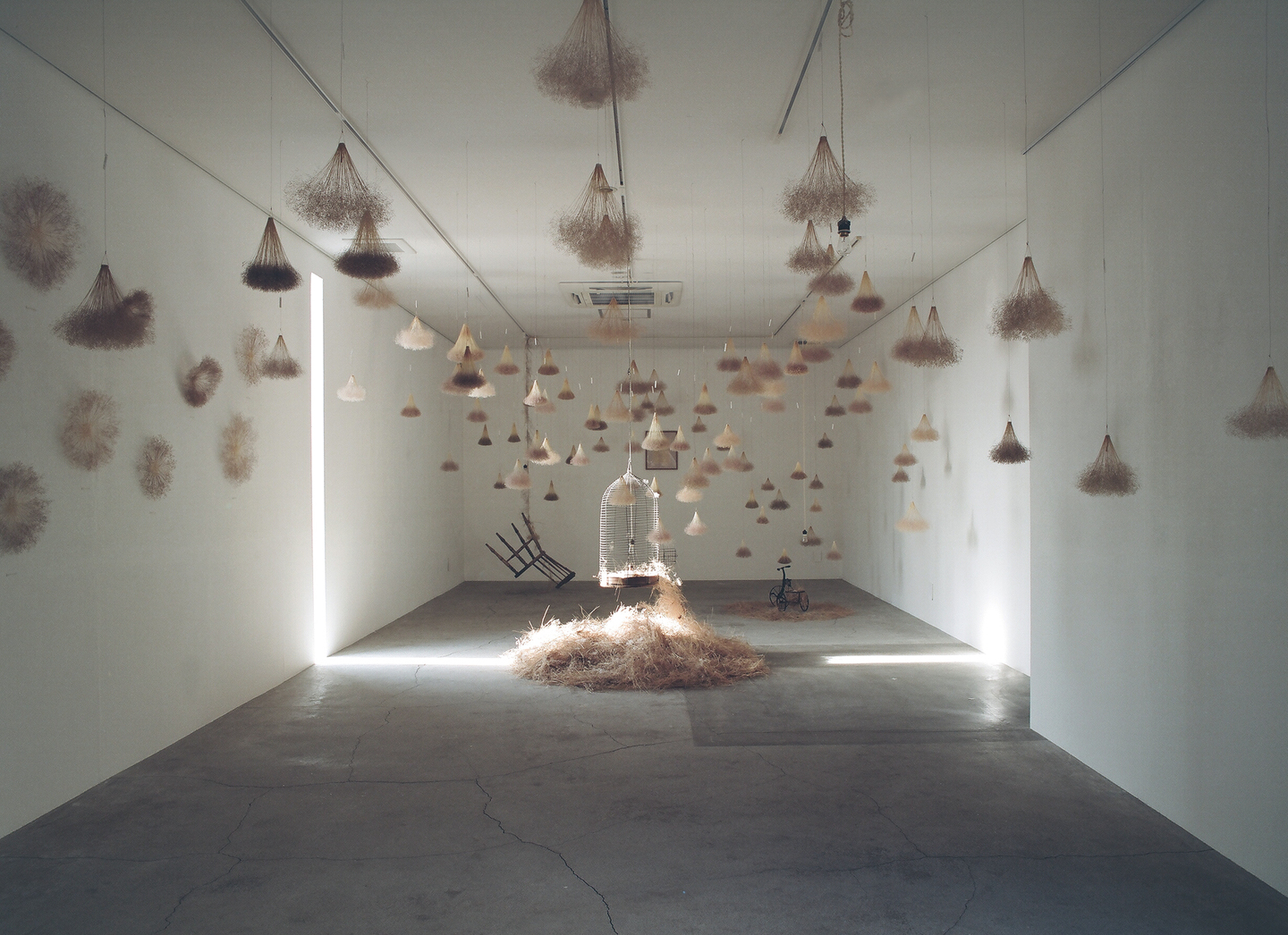 草と詩文のインスタレーション < 草のサークルから逃げ出した鳥と僕 >