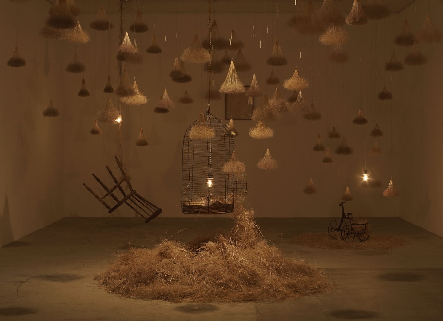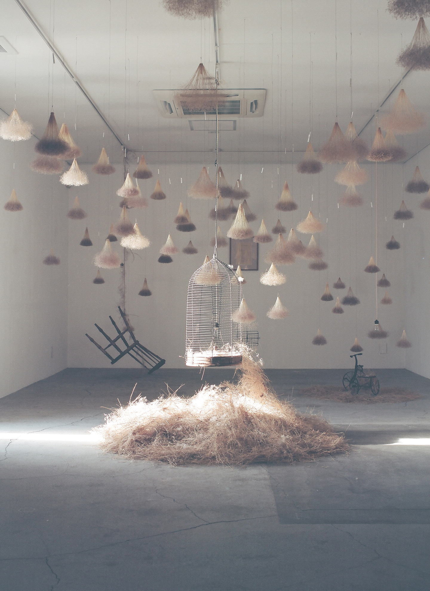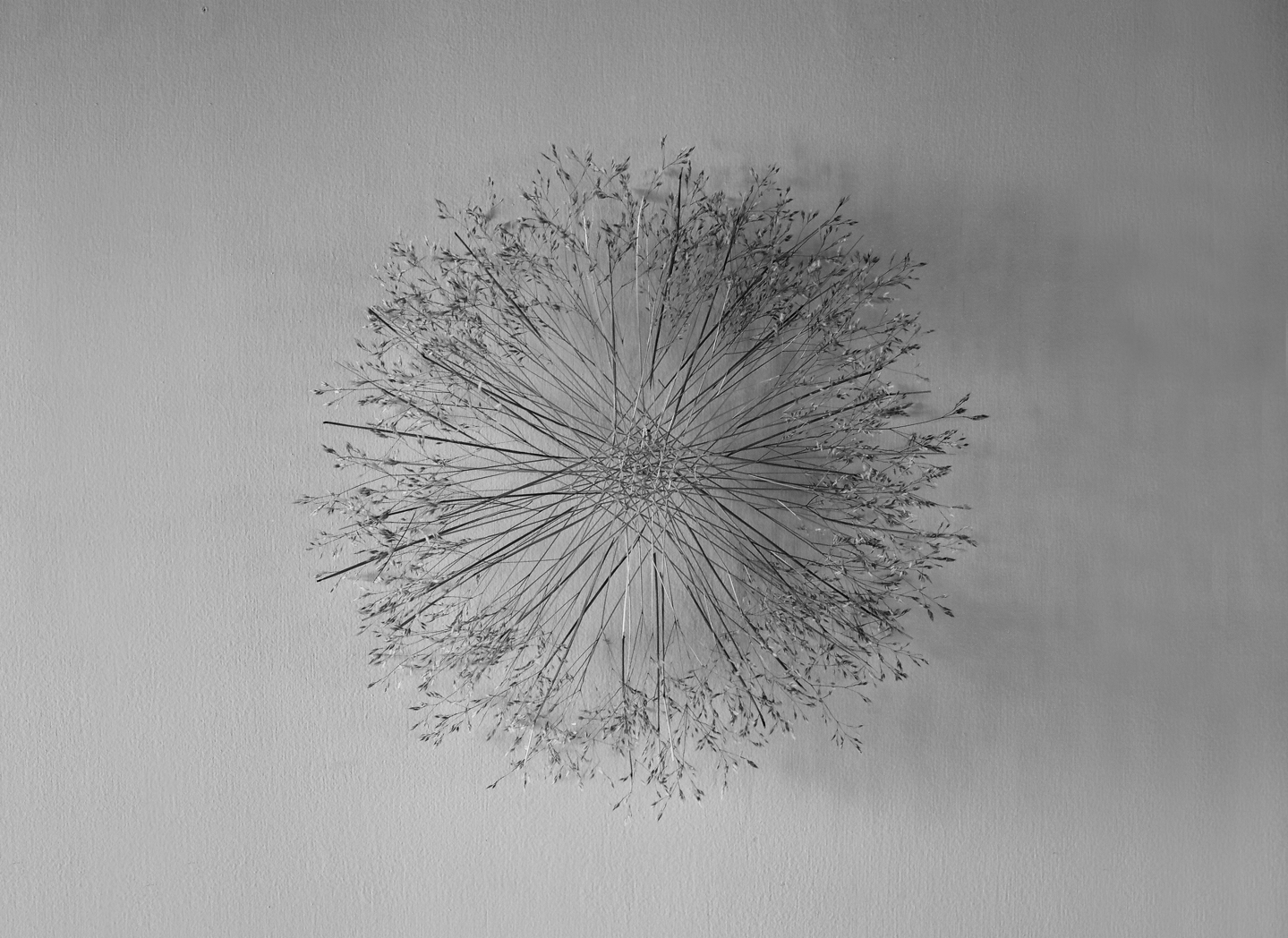 草と詩文のインスタレーション < 草のサークルから逃げ出した鳥と僕 >