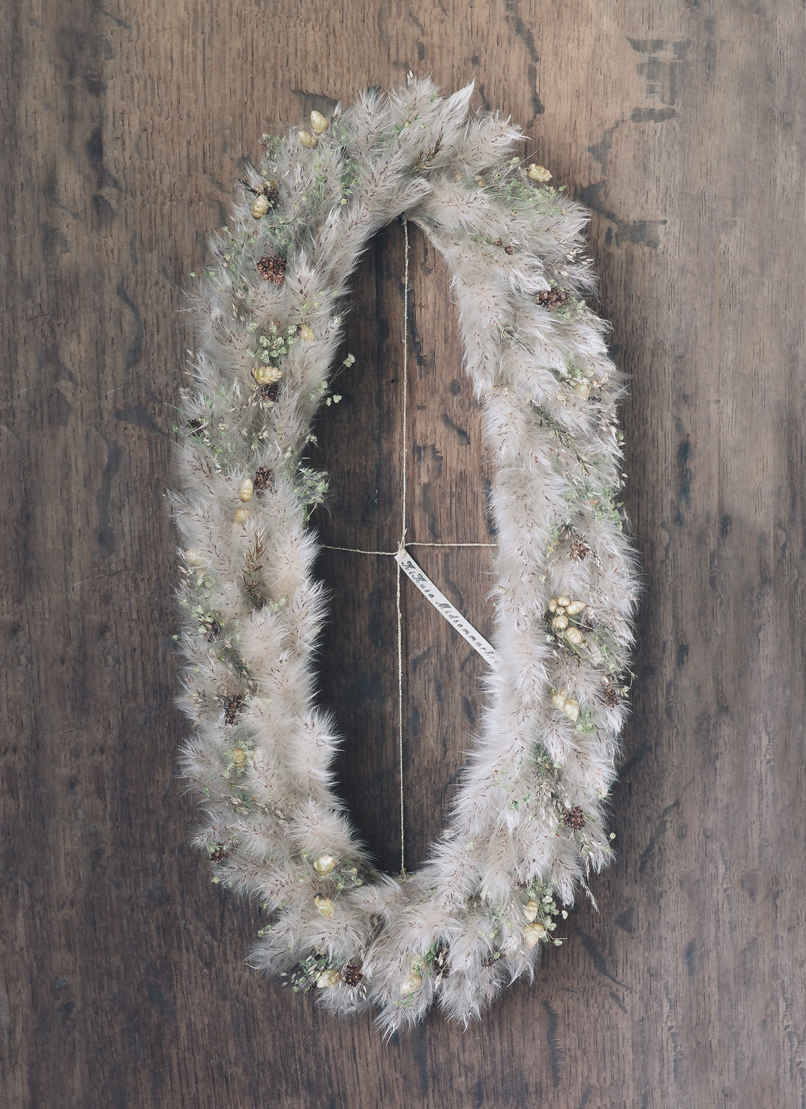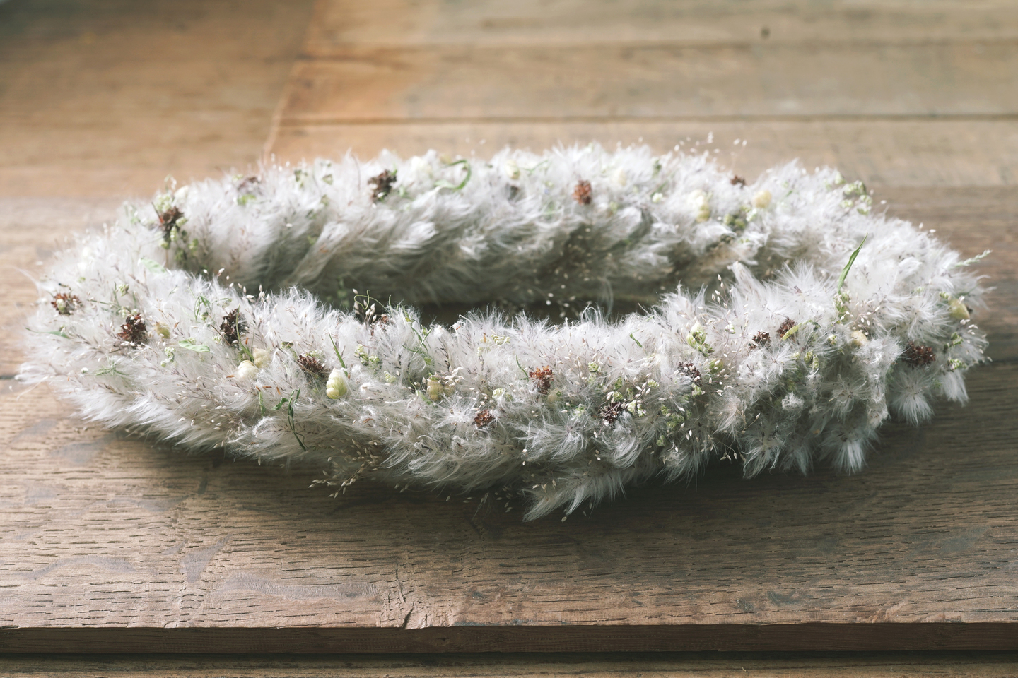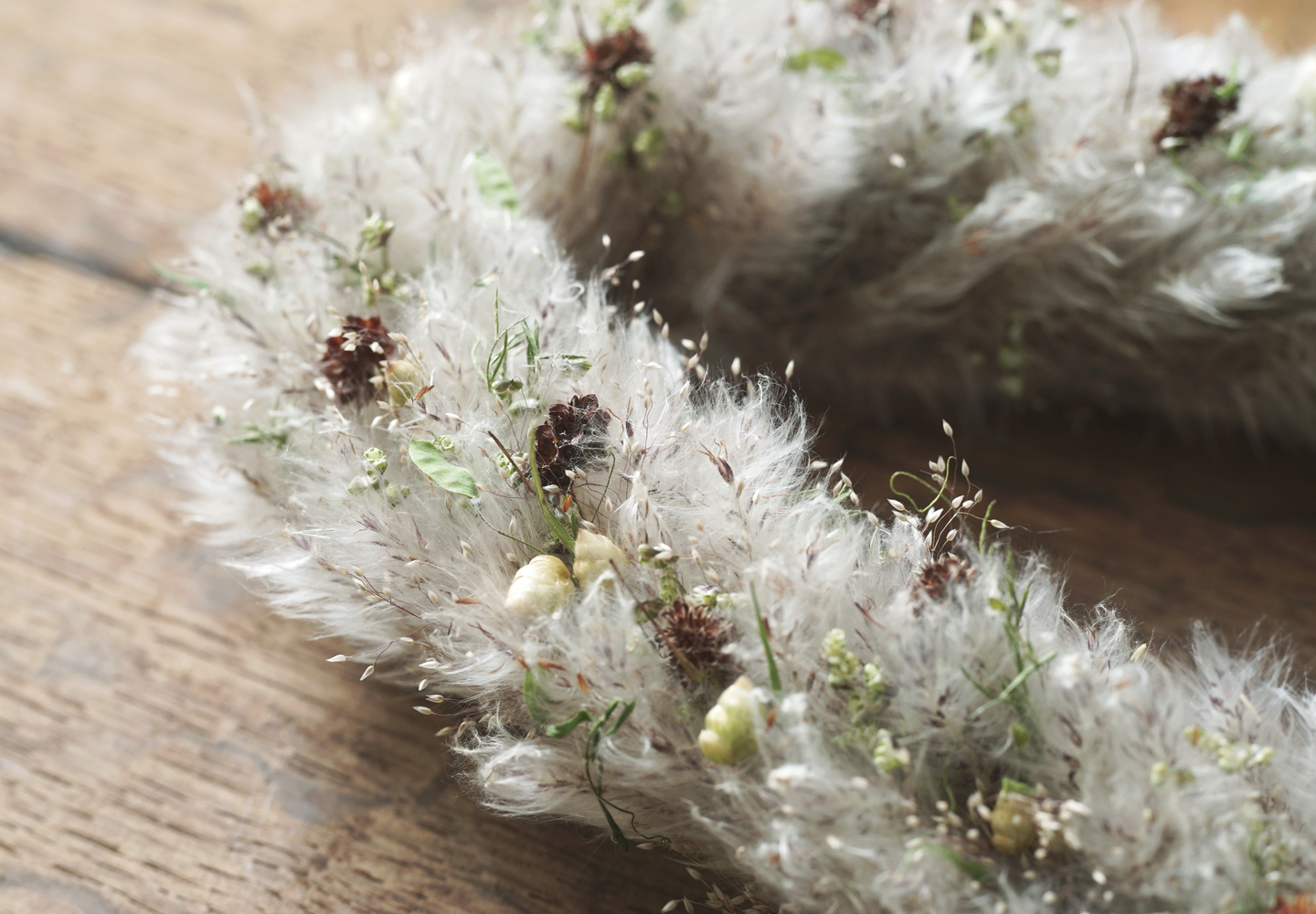 邪気を祓い千歳の生命力をもたらす茅萱(ちがや)を使い、夏至に近づく頃に生える七種の草を編み込んだドライ植物の草の冠。