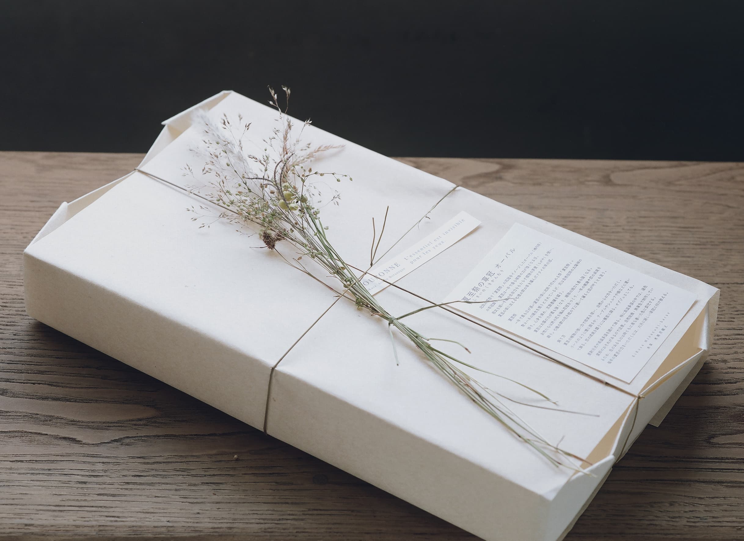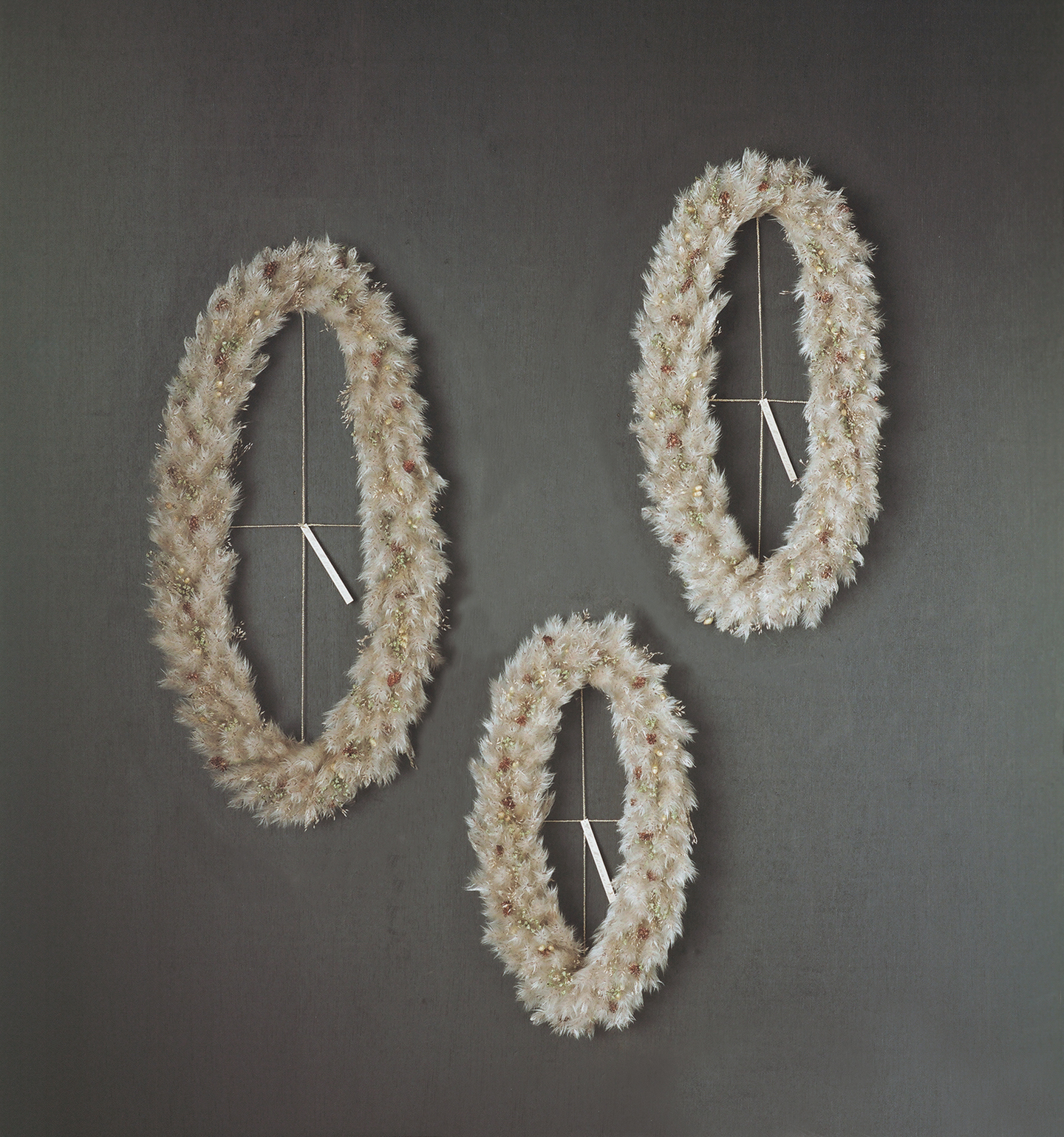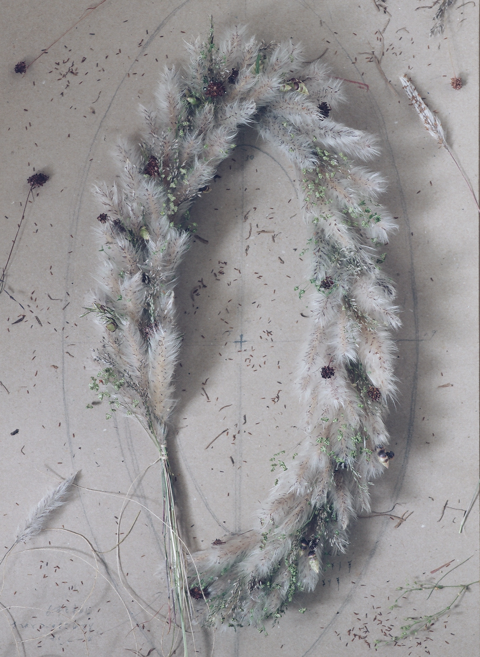 邪気を祓い千歳の生命力をもたらす茅萱(ちがや)を使い、夏至に近づく頃に生える七種の草を編み込んだドライ植物の草の冠。
