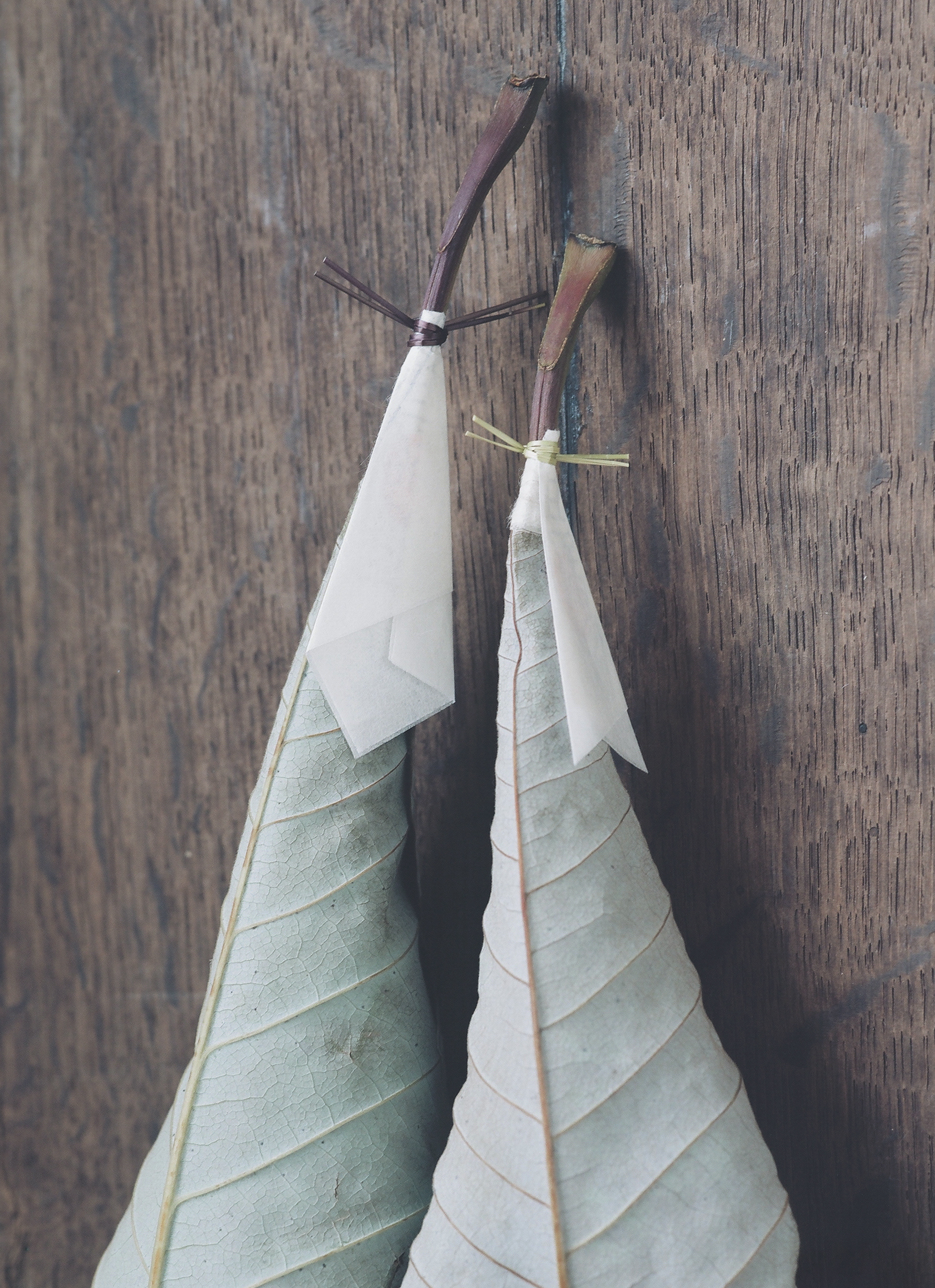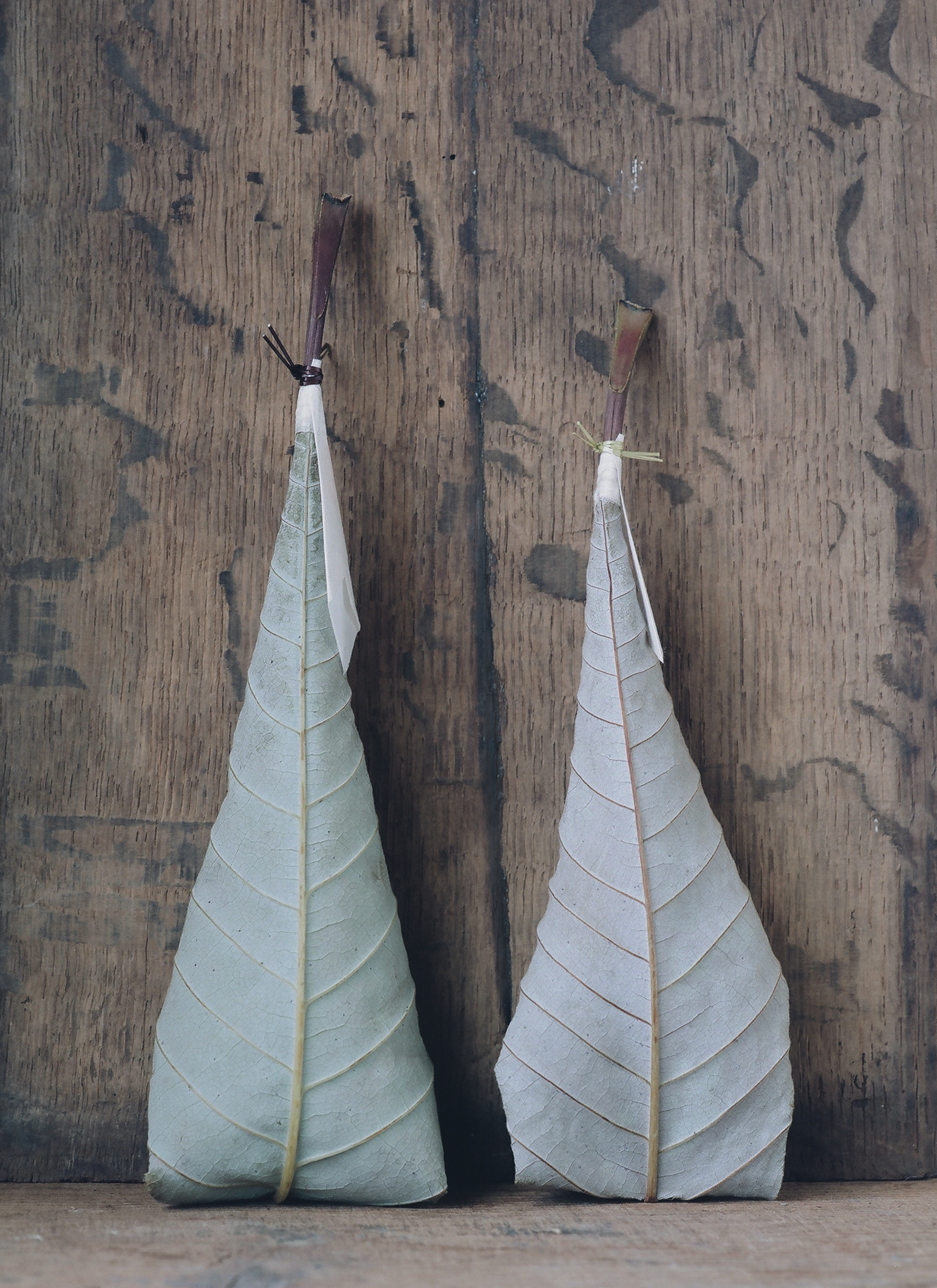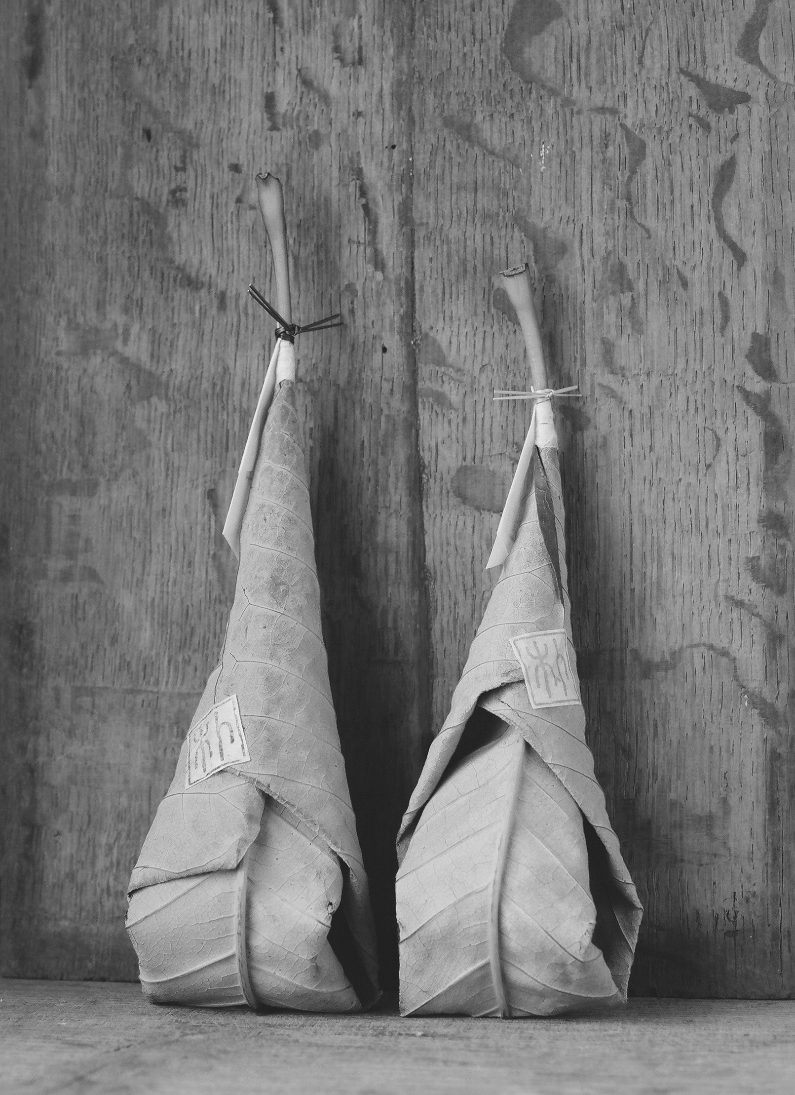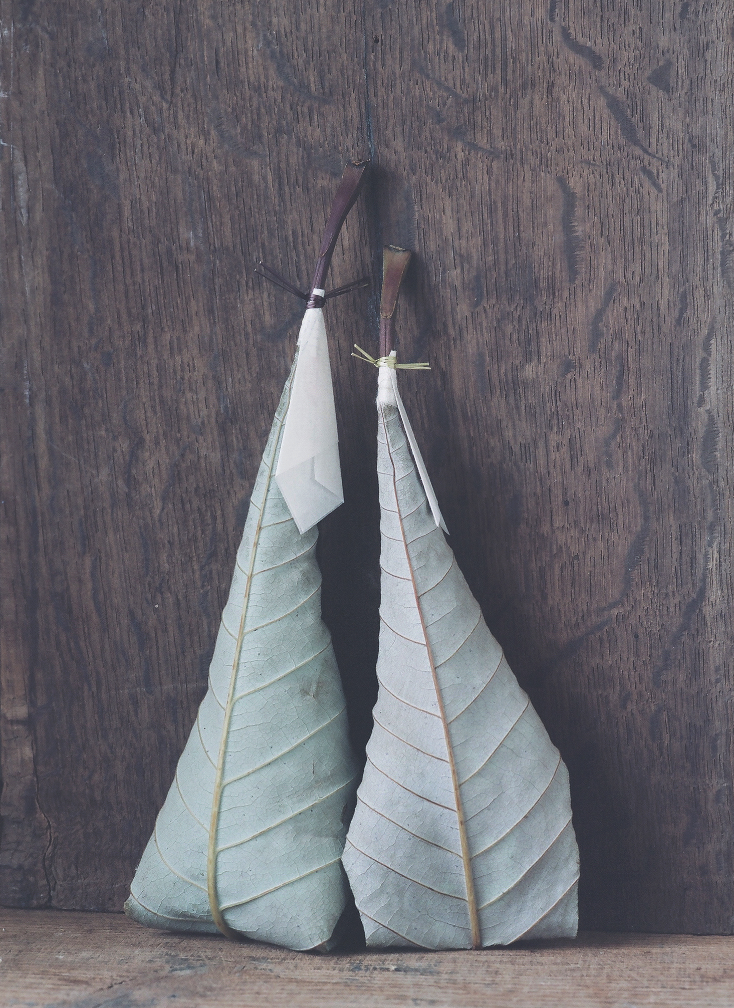 朴の木(ほおのき)の葉で自然神を包む番い(つがい)のお守り。