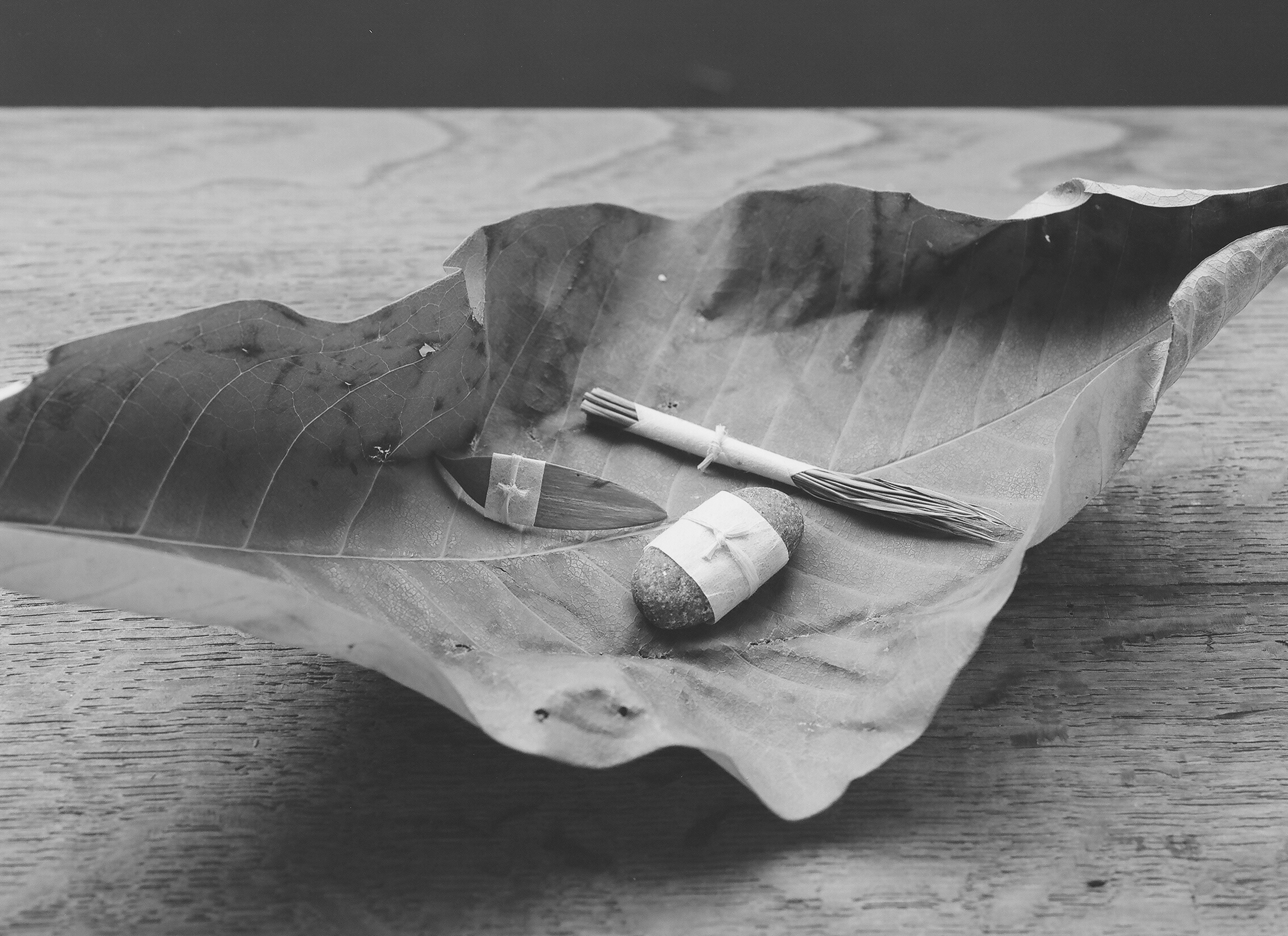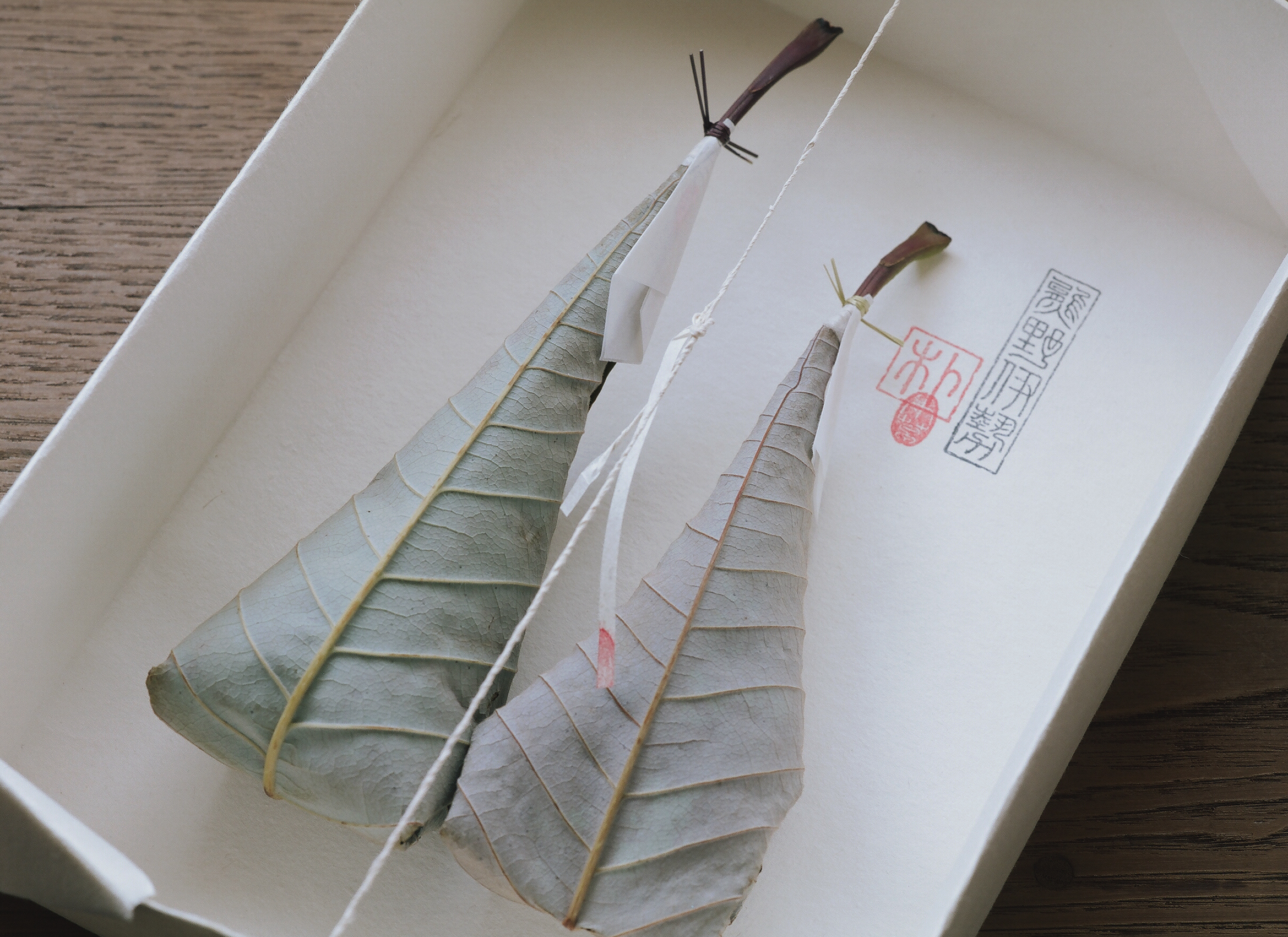 石(男石・女石)、梛(なぎ)の葉、茅萱(ちがや)の葉、三つの自然神を朴の葉で包む。