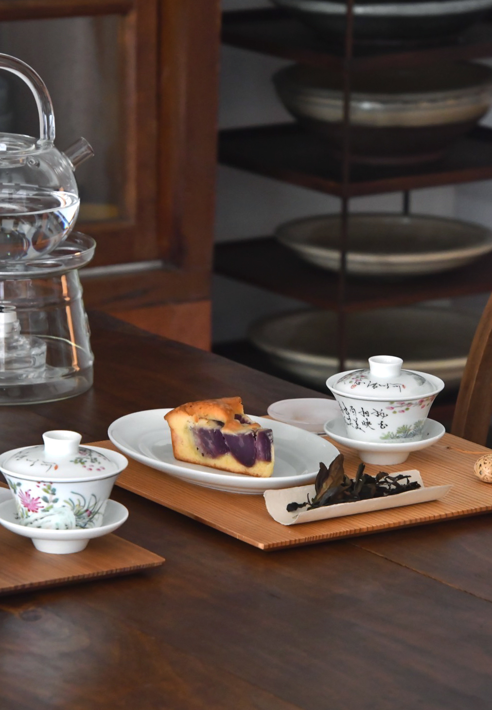 KiKusa展に合わせて、KiKusaが自然農法で作る紫芋を使った焼き菓子と小慢の中国茶のセットをご用意いたしました。