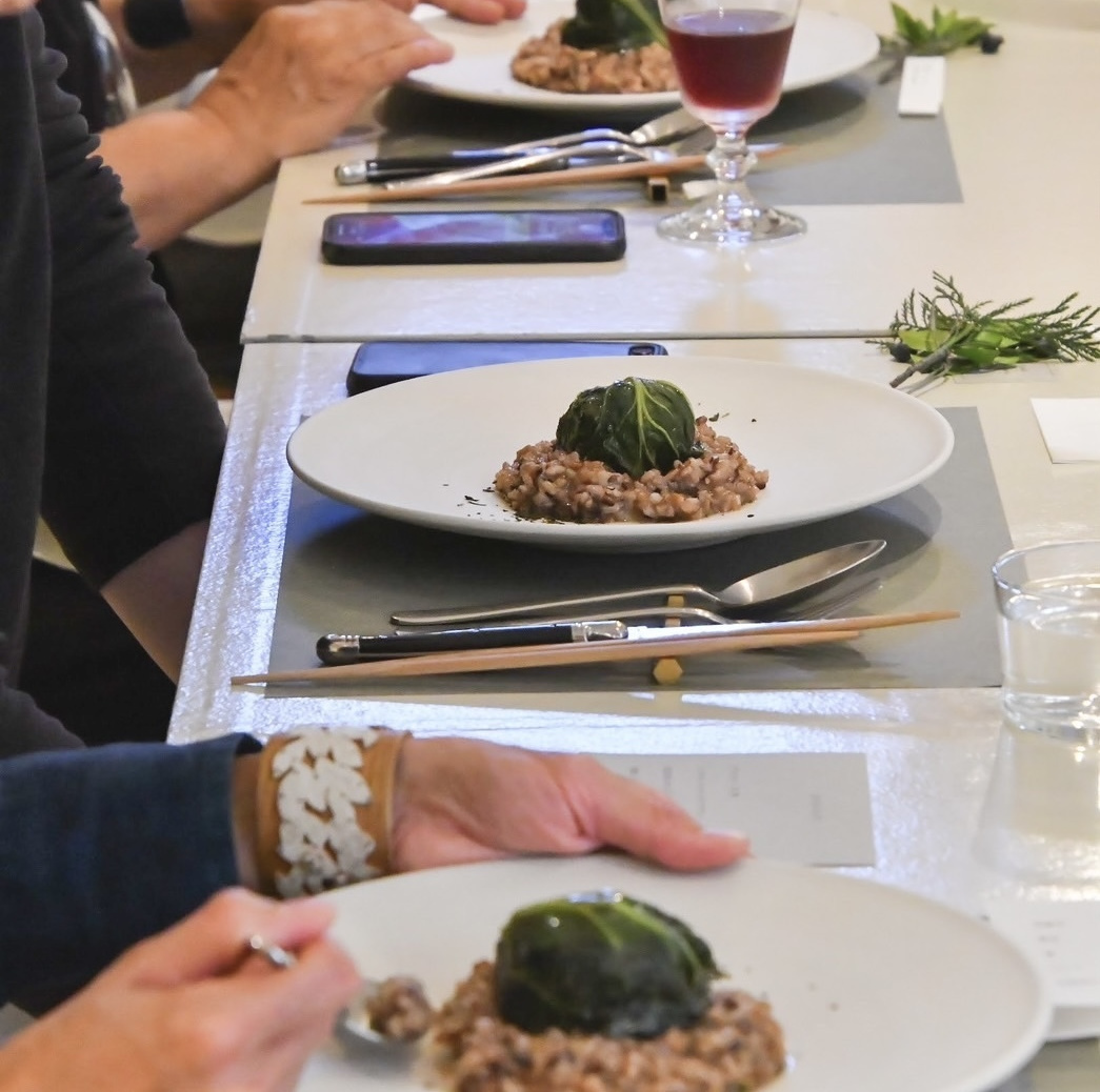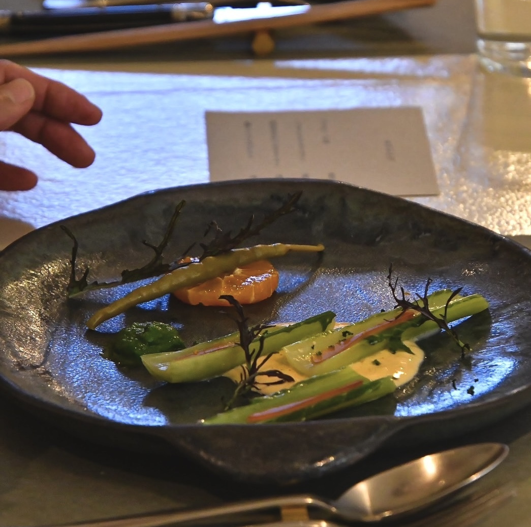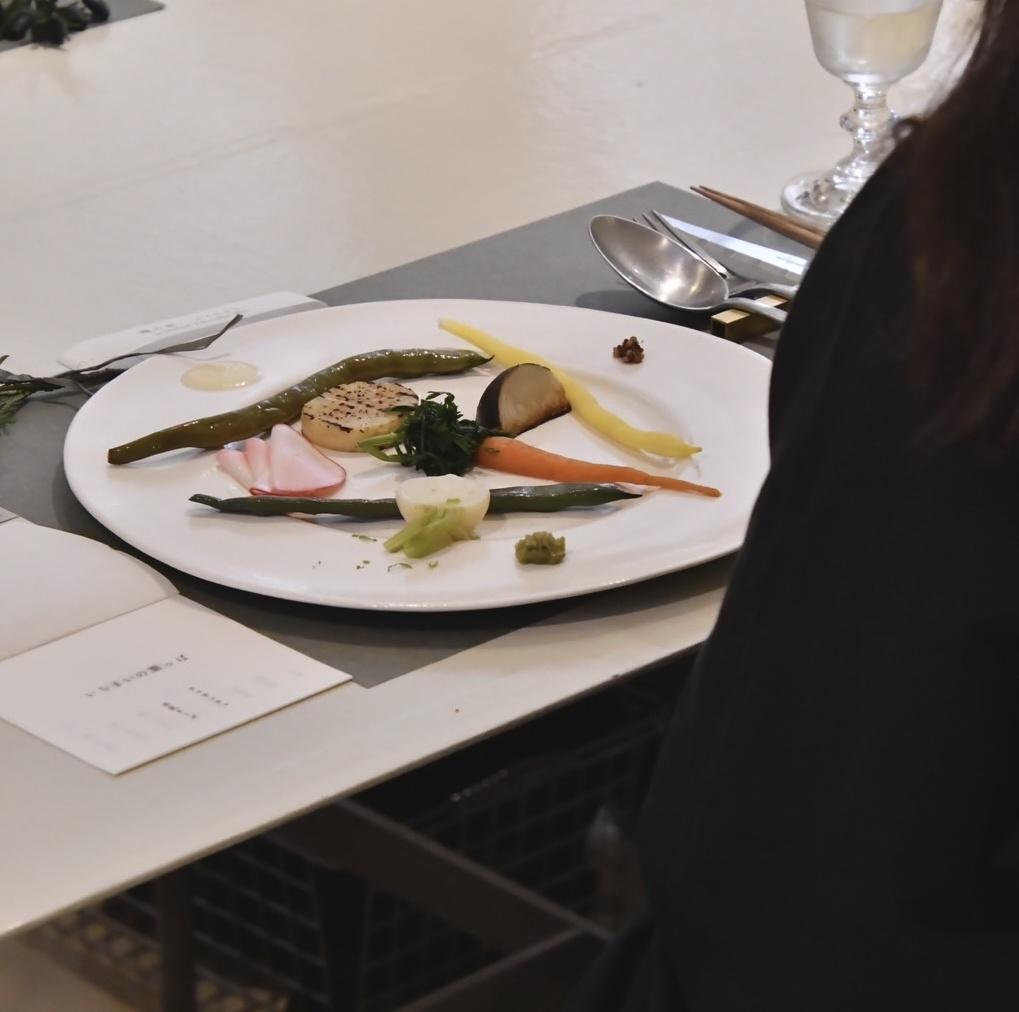 KiKusaが手掛ける自然農の野菜「野の菜-NONONA」・自然農米「野の禾-NONOINE」を使った創作コース料理をいただく。