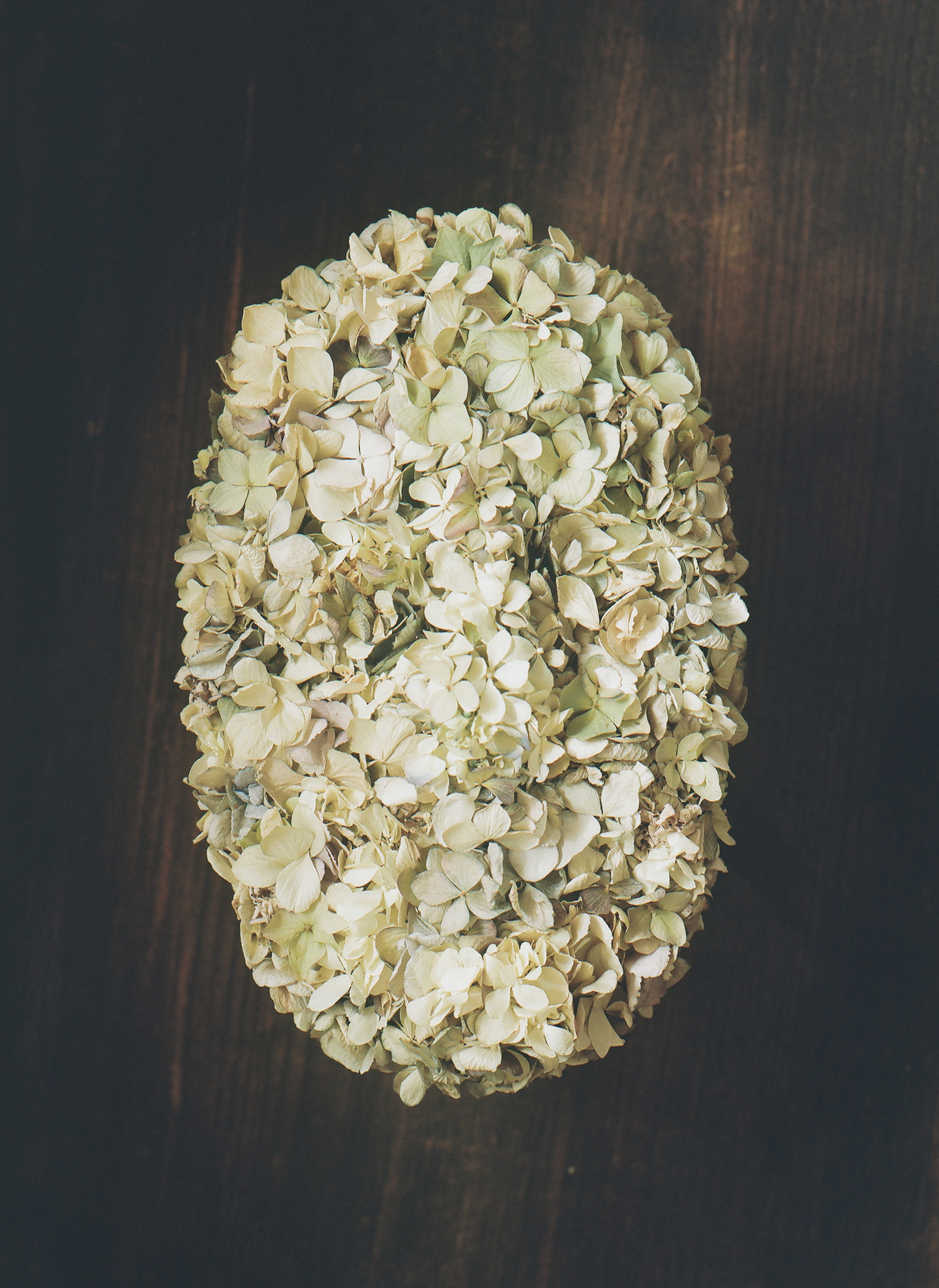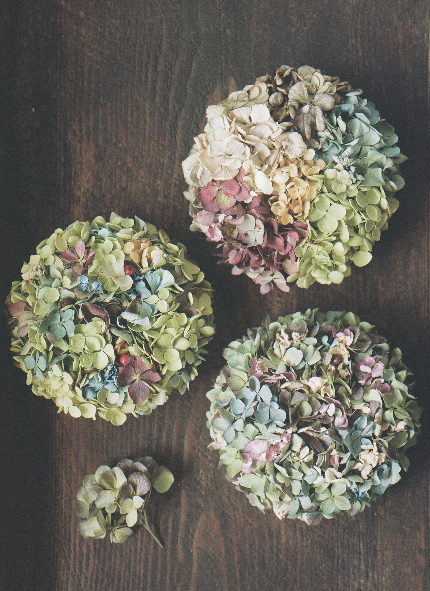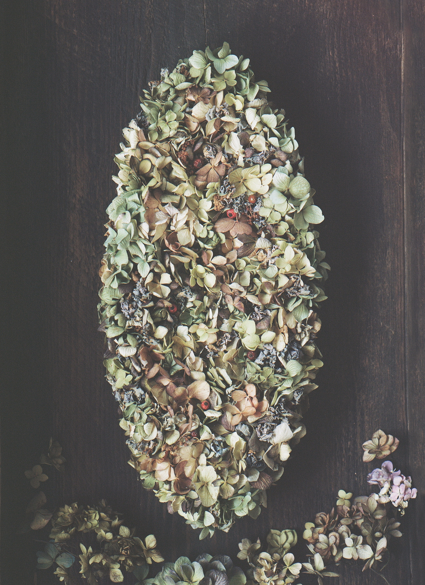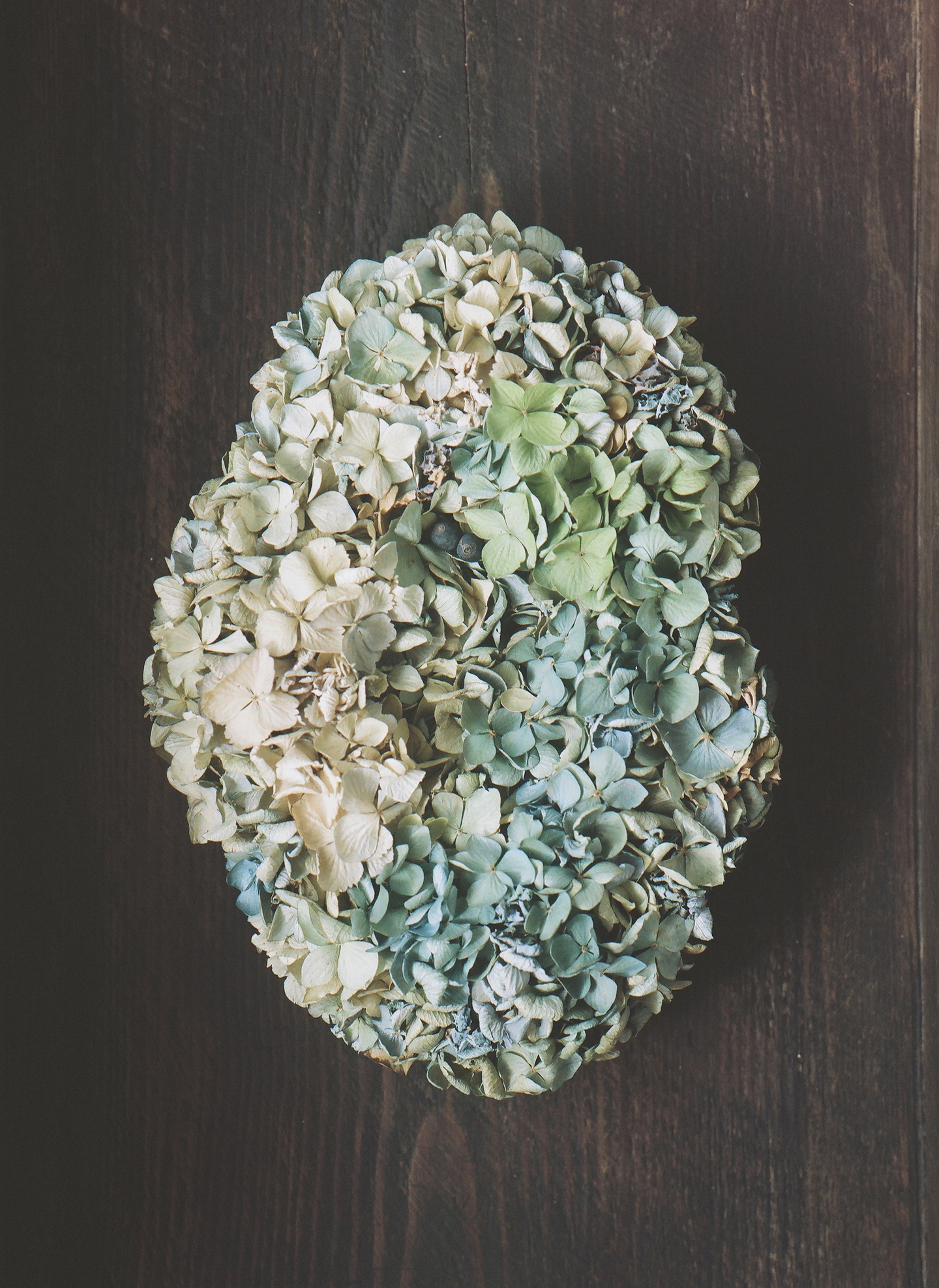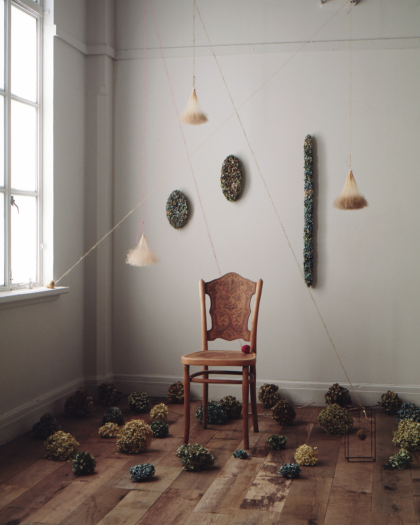 インスタレーション「青の転生」では、乾いた(ドライ)の紫陽花を用いて空間に絵を描く。