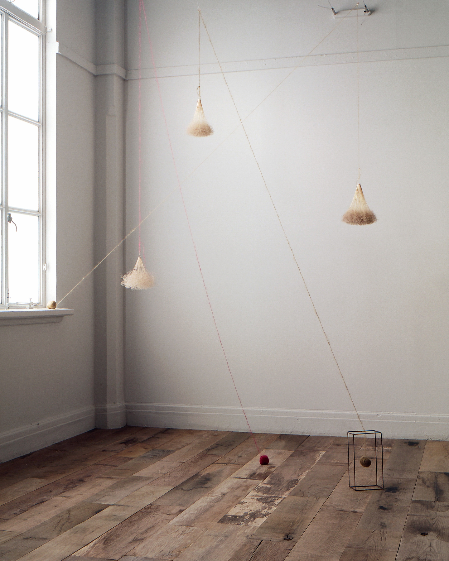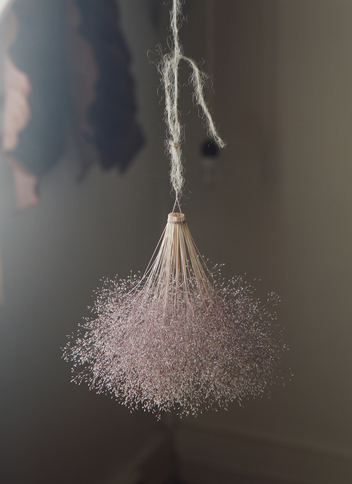 吊るす糸は草木染のカラフルな”モヘアの毛糸”と、天井に引っ掛けるリングには19世紀アンティークの骨製リングをセットにした特別仕様。