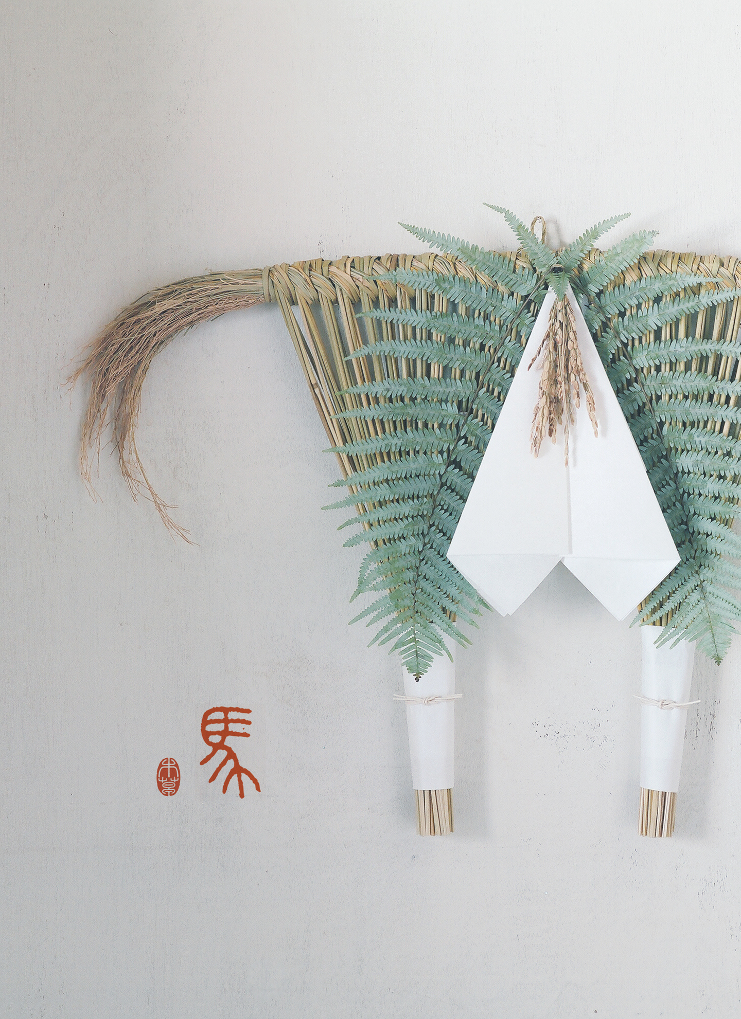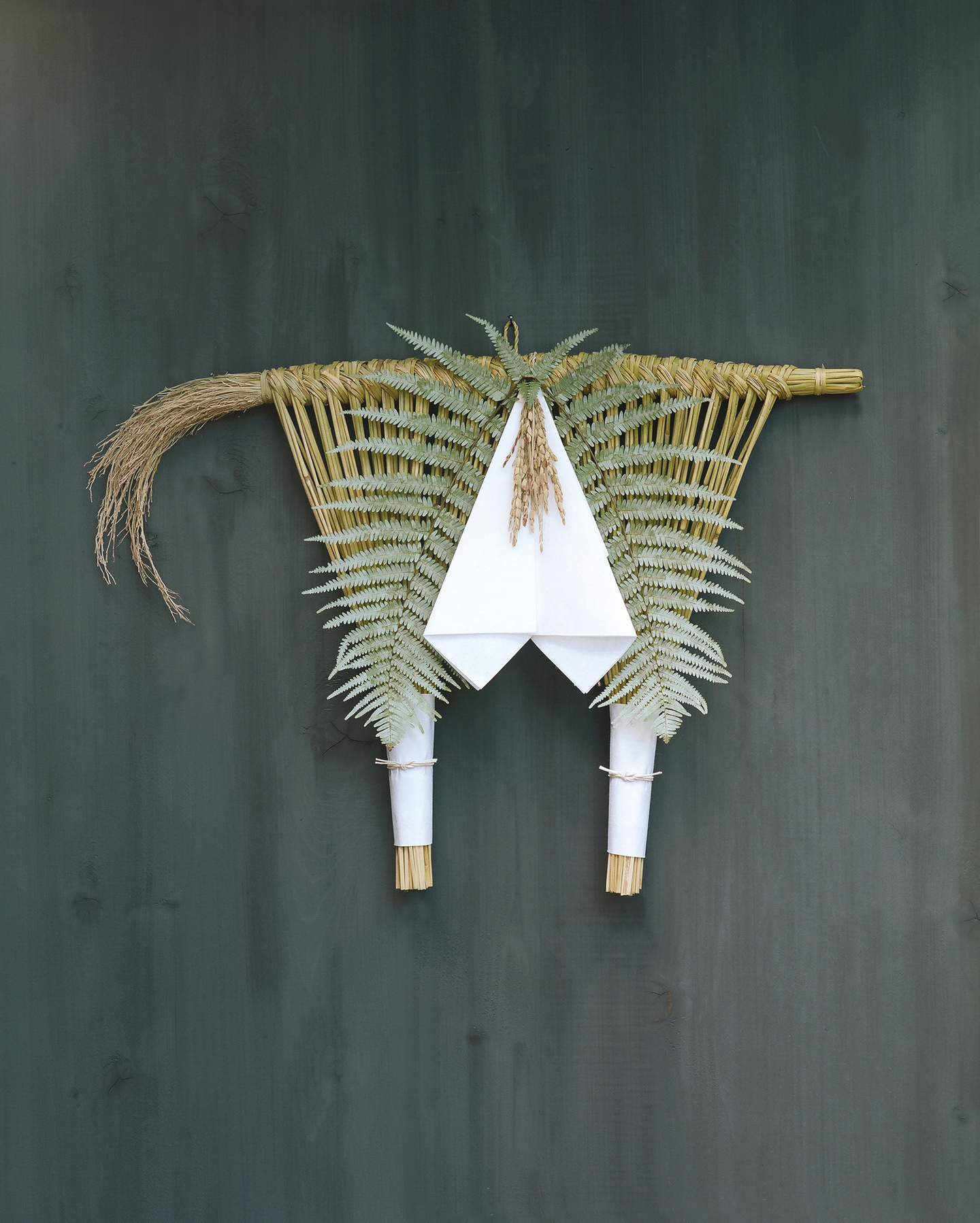 飾り付けには、生命力を強める「稲穂」、心の清らかさと豊穣を表す「裏白」を付ける。