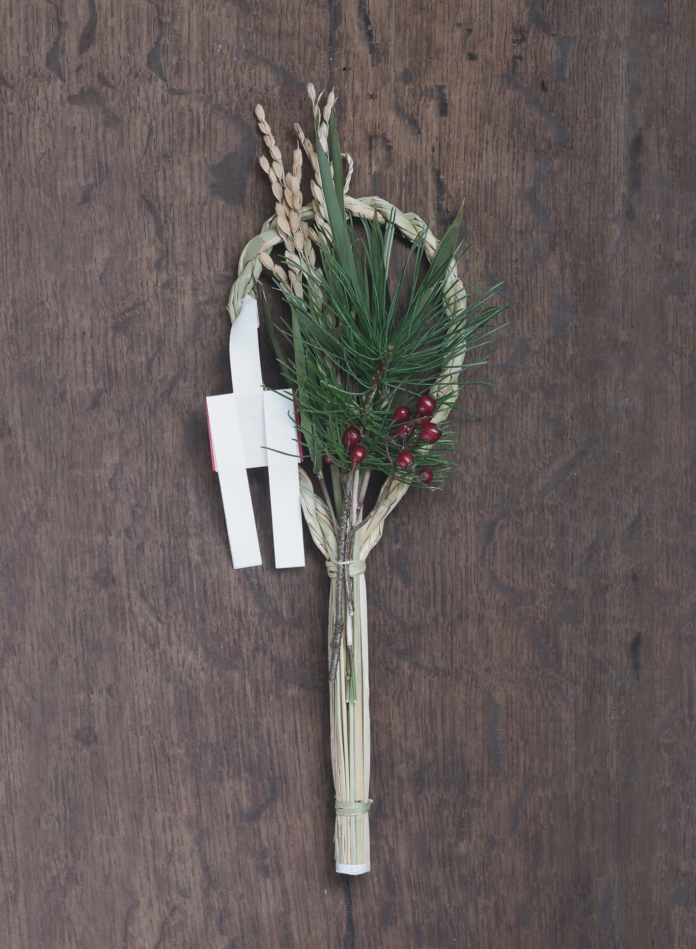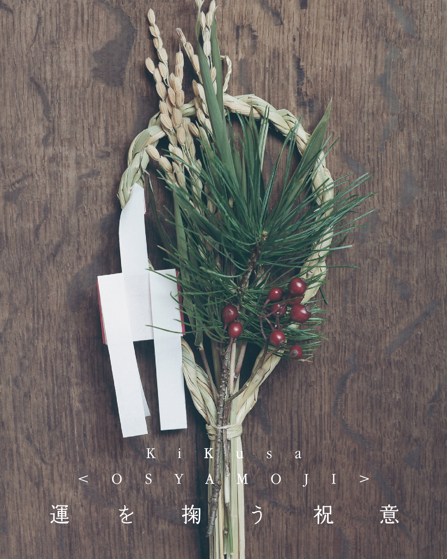 稲藁でつくる杓文字形に、祓い清めの「紙垂」、豊穣を表す「稲穂」、生命力を司る「竹・笹」、長寿や仕事運気を上げるという縁起の良い「五葉松」、魔除けと祝いの赤い実の「野茨」を飾り付ける。