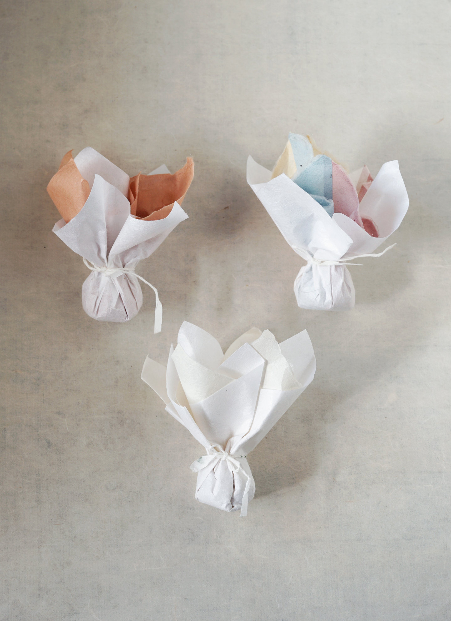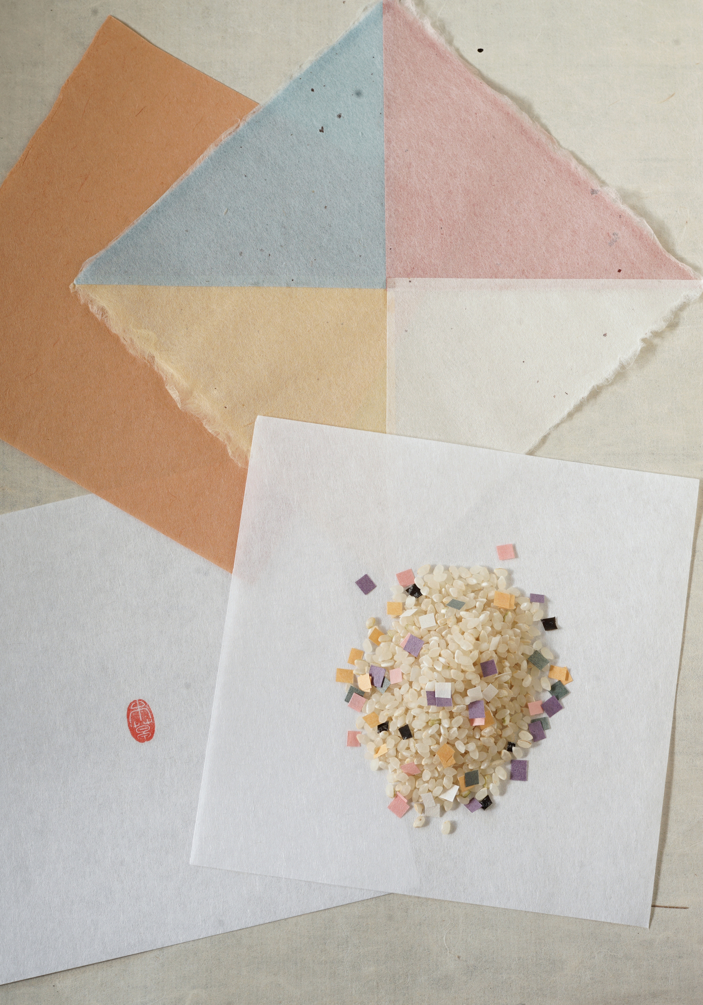 筒の中に入れる包み紙『福包み』は、生命力を表す「米」、福を授かる意の「昆布」、魔除けの「五色の紙」を入れ色和紙で包む。