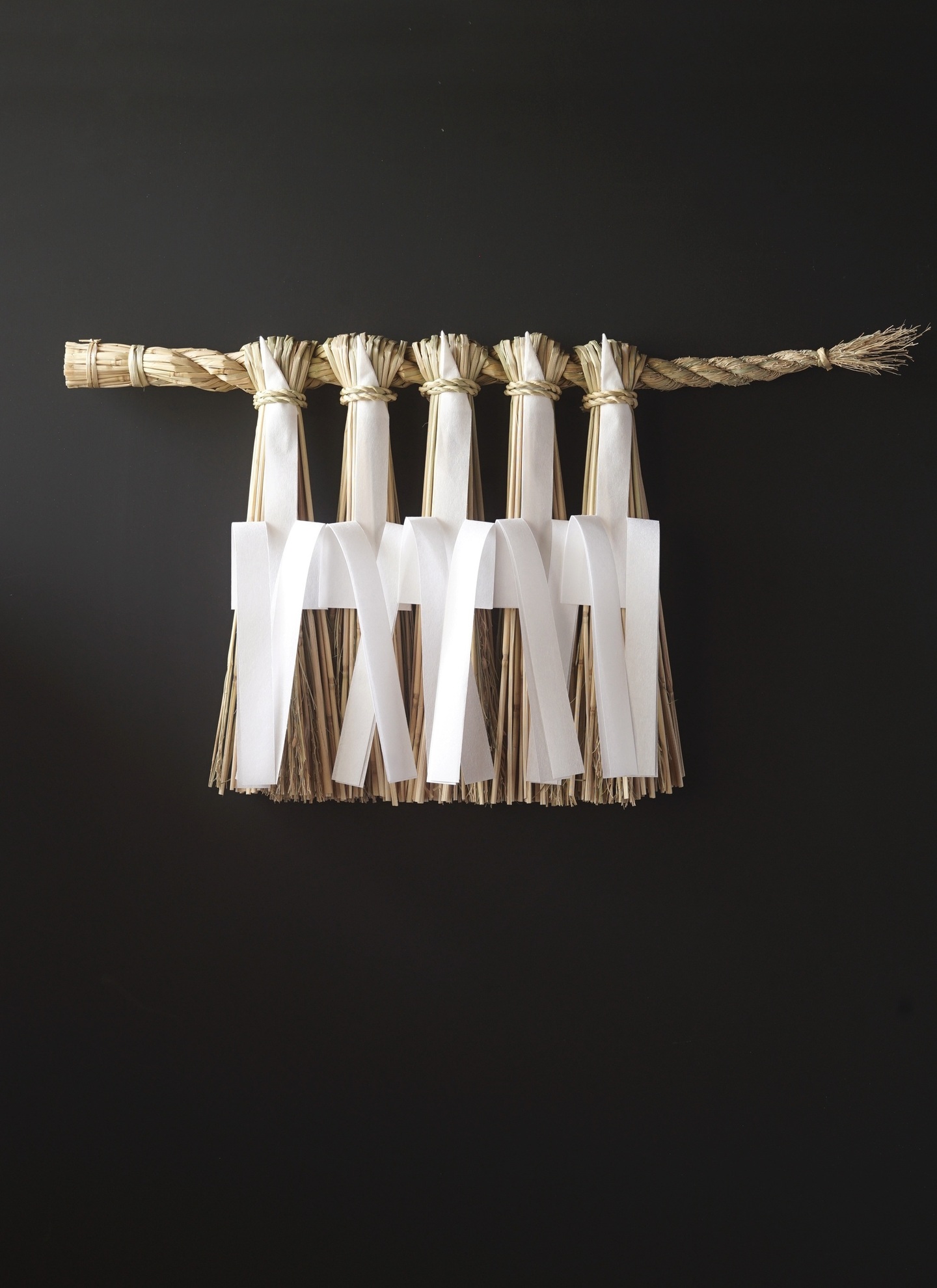 飾り付けの無い、稲藁と紙垂だけでつくられるシンプルな注連縄は、日本的”侘び”の感性と霊性が宿る。