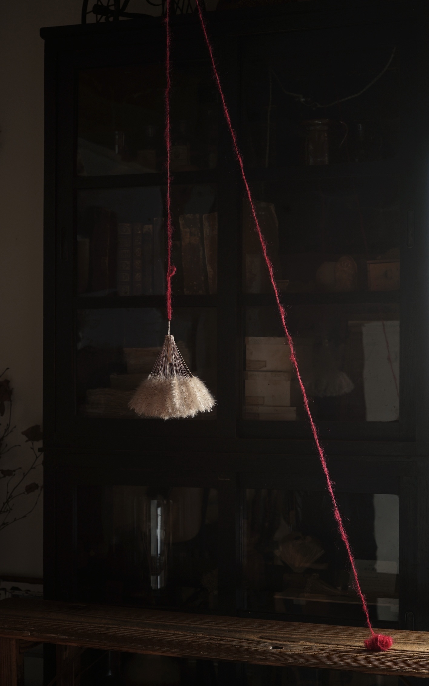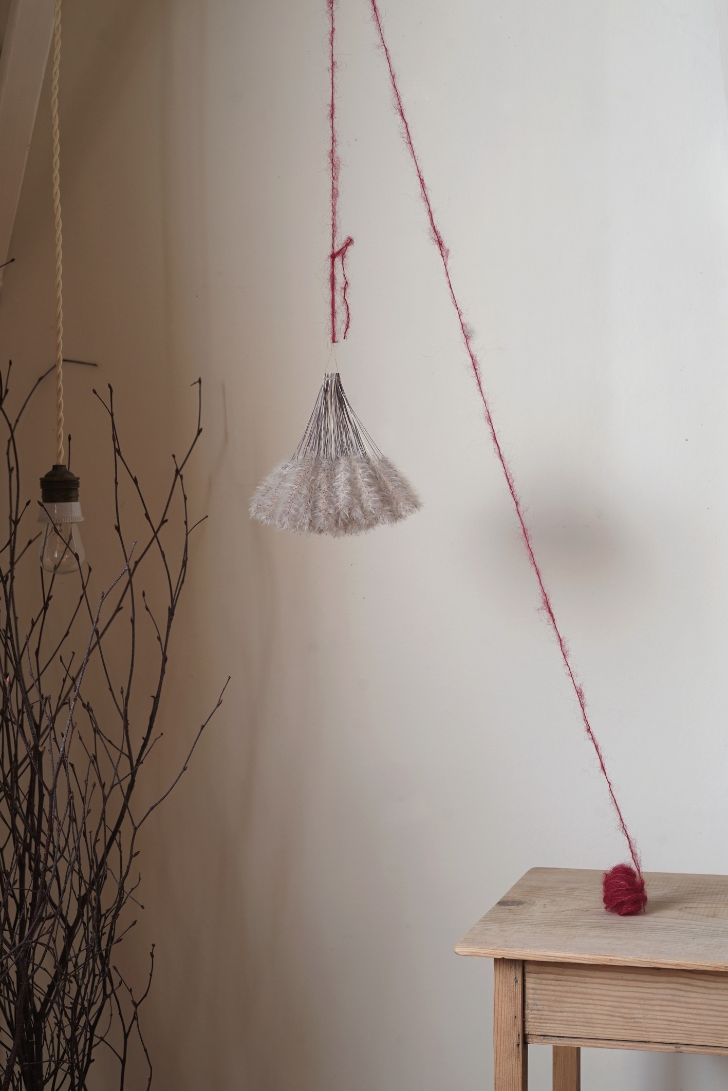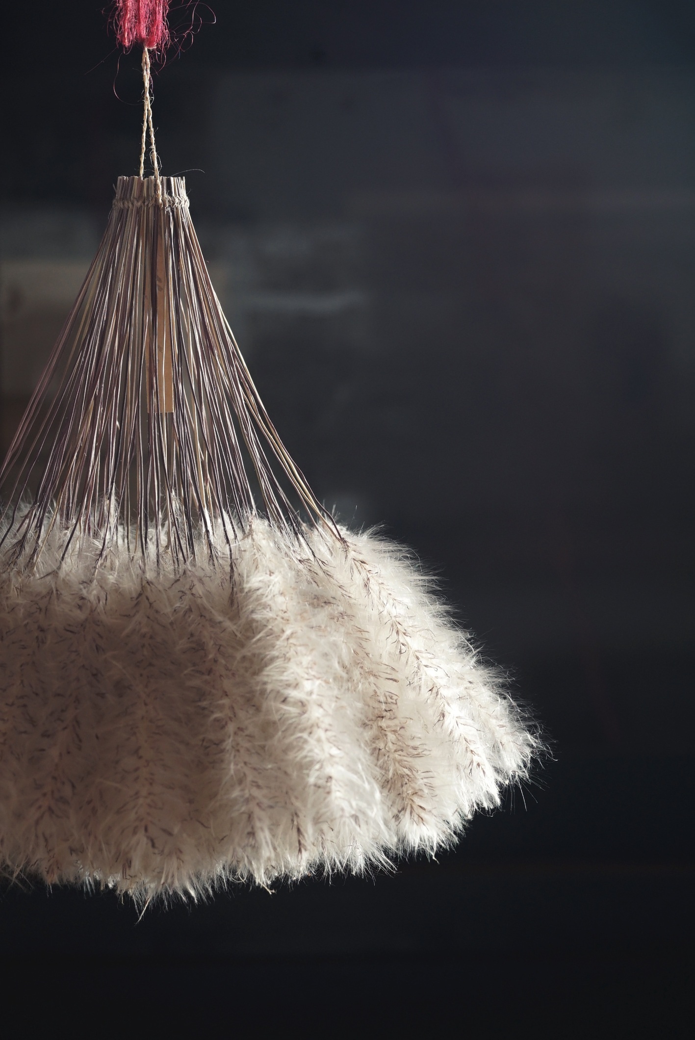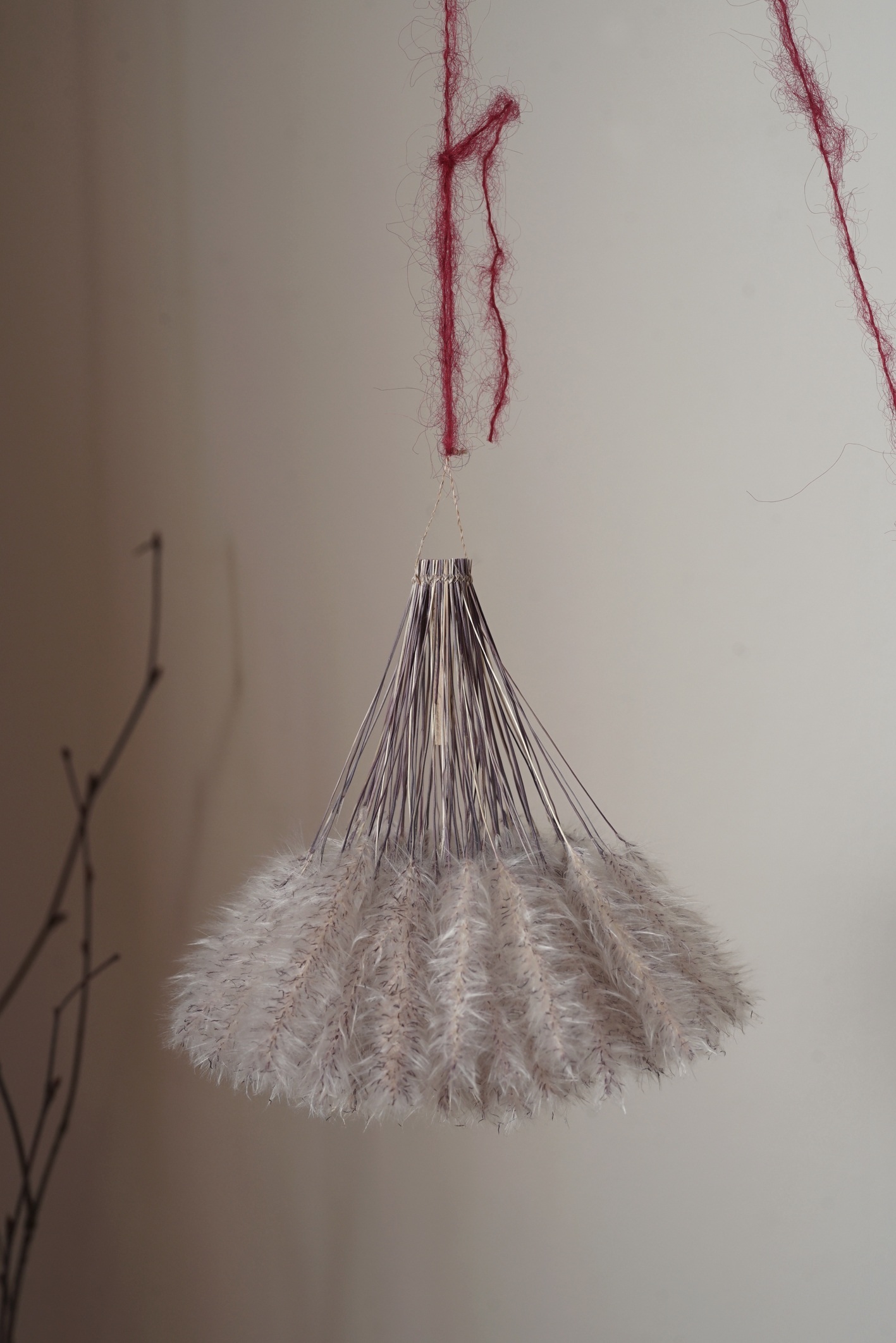 茅萱の白い穂と赤色のモヘアの毛糸の紅白のコントラストが目を引く作品。